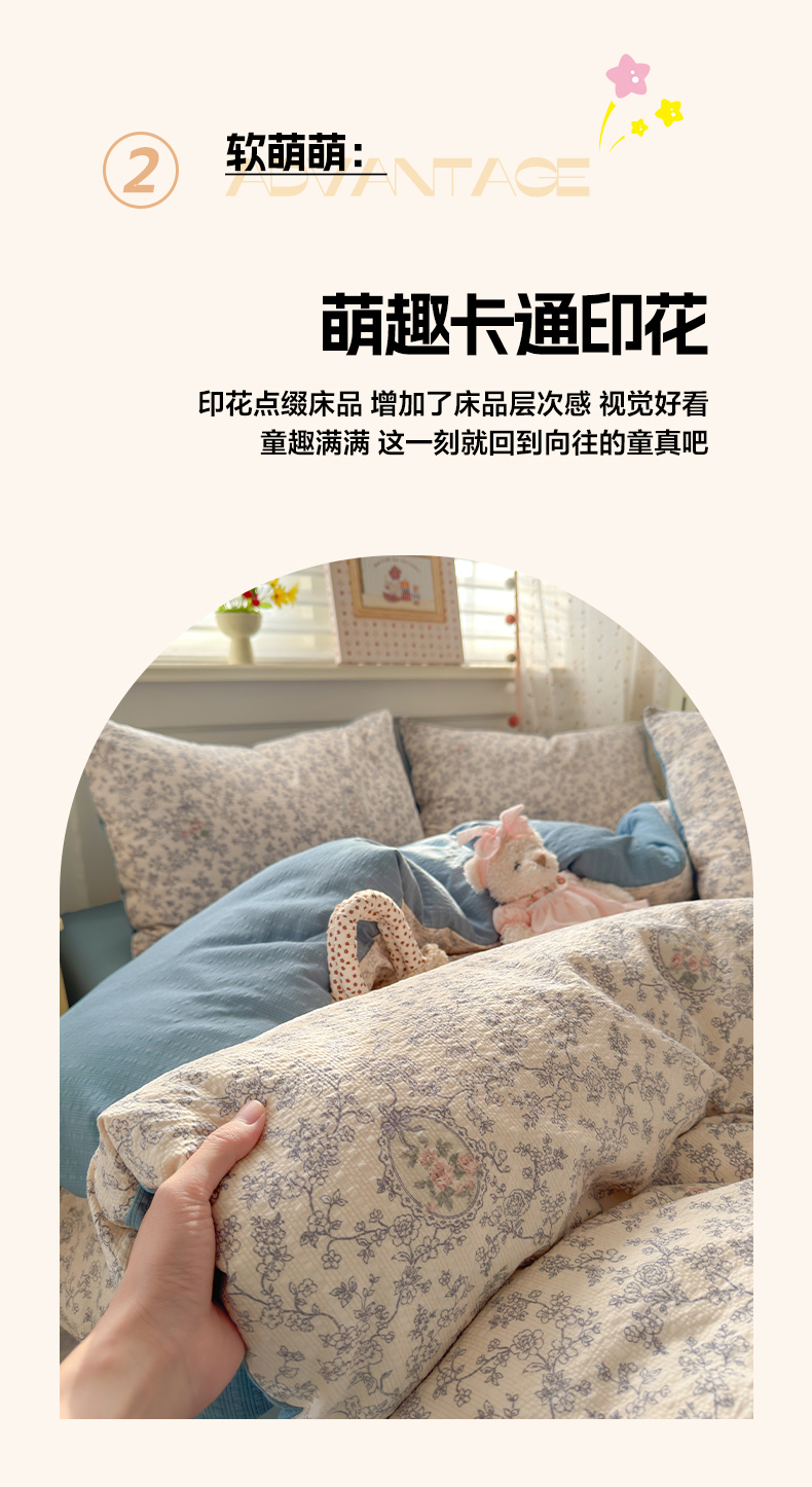 当前位置: 91家纺网 > 商品网购 > 床品套件 > 四件套 > 双层纱四件套 > 优承佳生活馆 2026新款卡通小清新风格高克重超柔软糯泡芙双层纱面料三件套四件套单被套系列 (提供买家秀) 浅陌