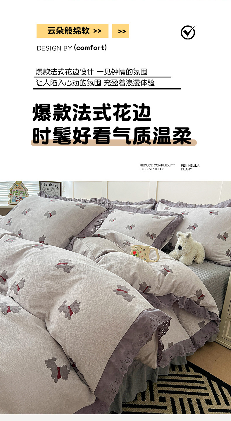 当前位置: 91家纺网 > 商品网购 > 床品套件 > 四件套 > 全棉普通四件套 > 富米莱(原臻工厂) 2026新款高克重爆款法式全棉纯棉花边四季款加厚色织提花床盖床裙四件套 提花-野蔷薇