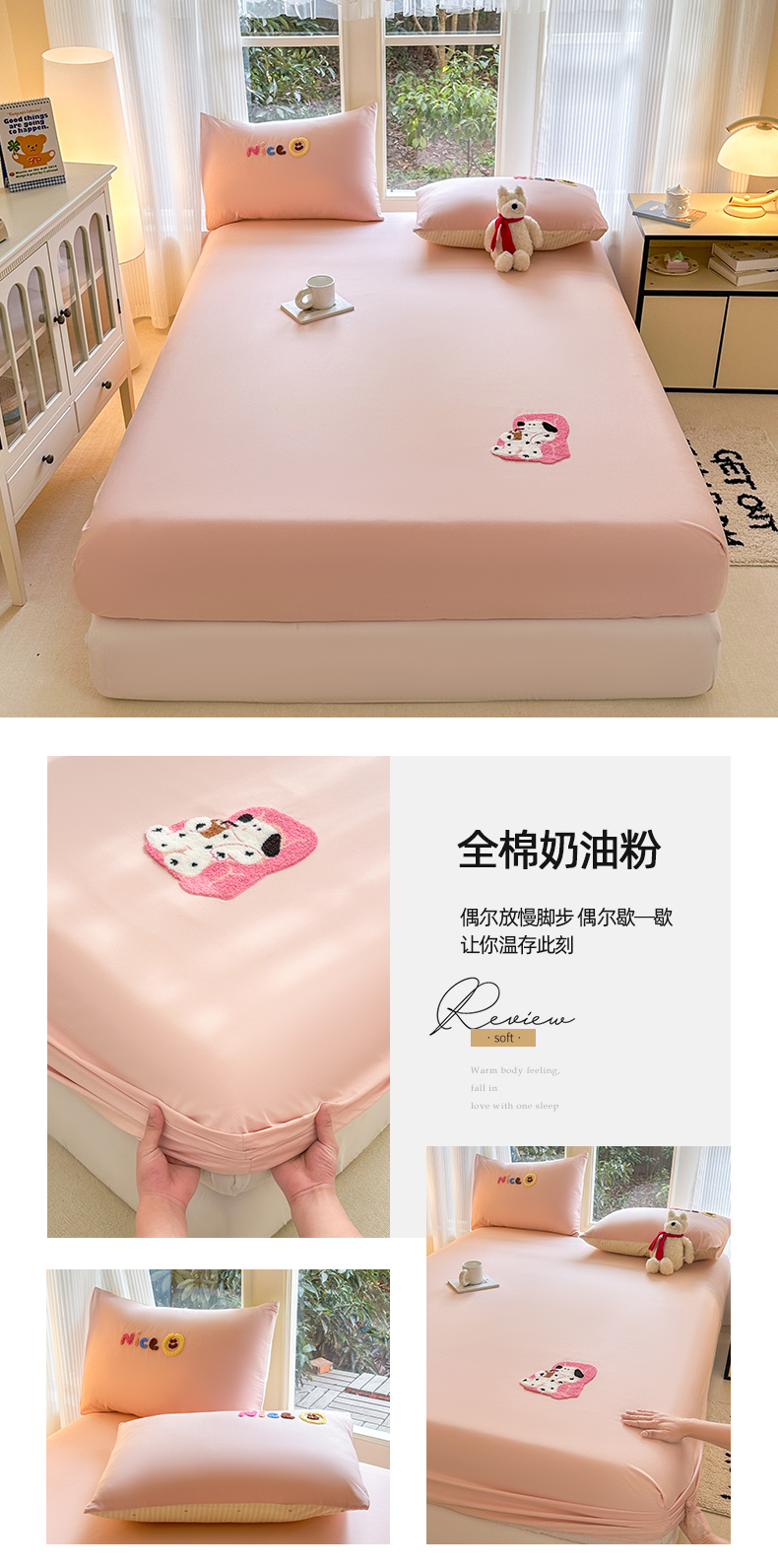 (总)布柔 2026新款床笠100%全棉纯棉13070绣花床笠(围高+30cm)-晚安,晚安床笠粉,晚安床笠黄,晚安床笠灰,晚安床笠绿,晚安床笠紫,组合图仅供展示-不可下单