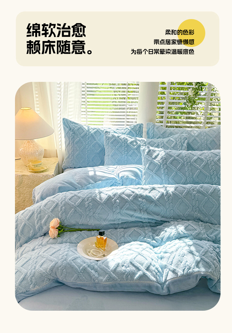 当前位置: 91家纺网 > 商品网购 > 床品套件 > 四件套 > 牛奶绒四件套 > 沐珩家纺 2026新款亲肤舒适加厚保暖塔芙绒牛奶绒系列四件套 冰川蓝