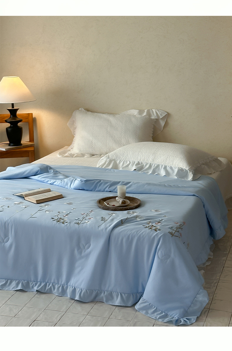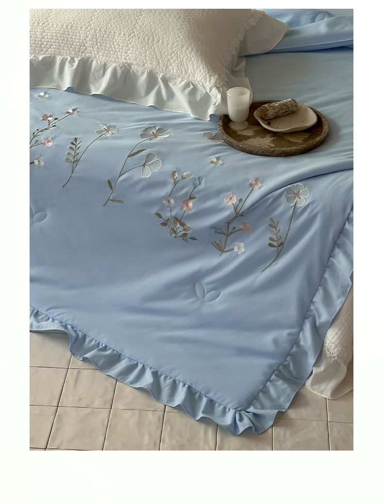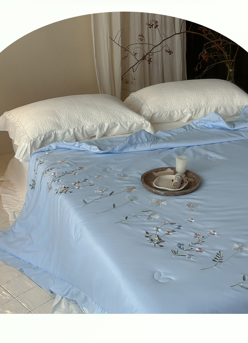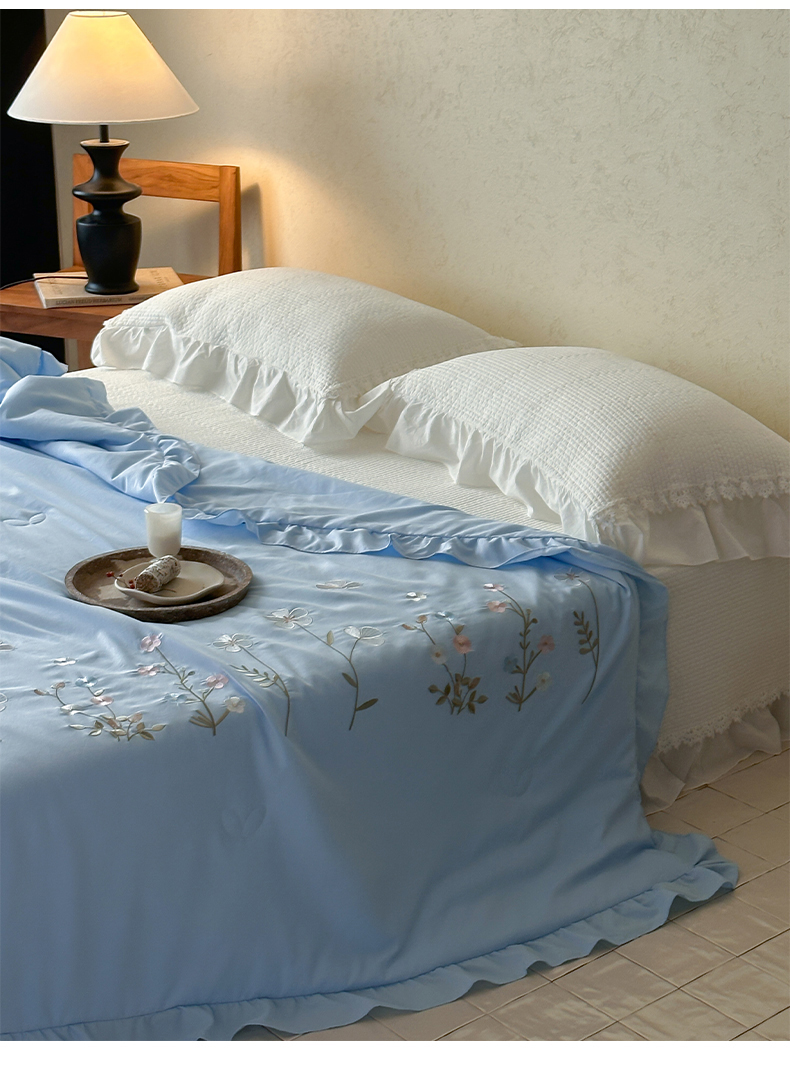 • 91家纺网 家纺一手货源 找家纺 一加一 2026新款亲肤凉感花边绣花大豆夏被夏凉被空调被四件套-花间序 花间序-蓝