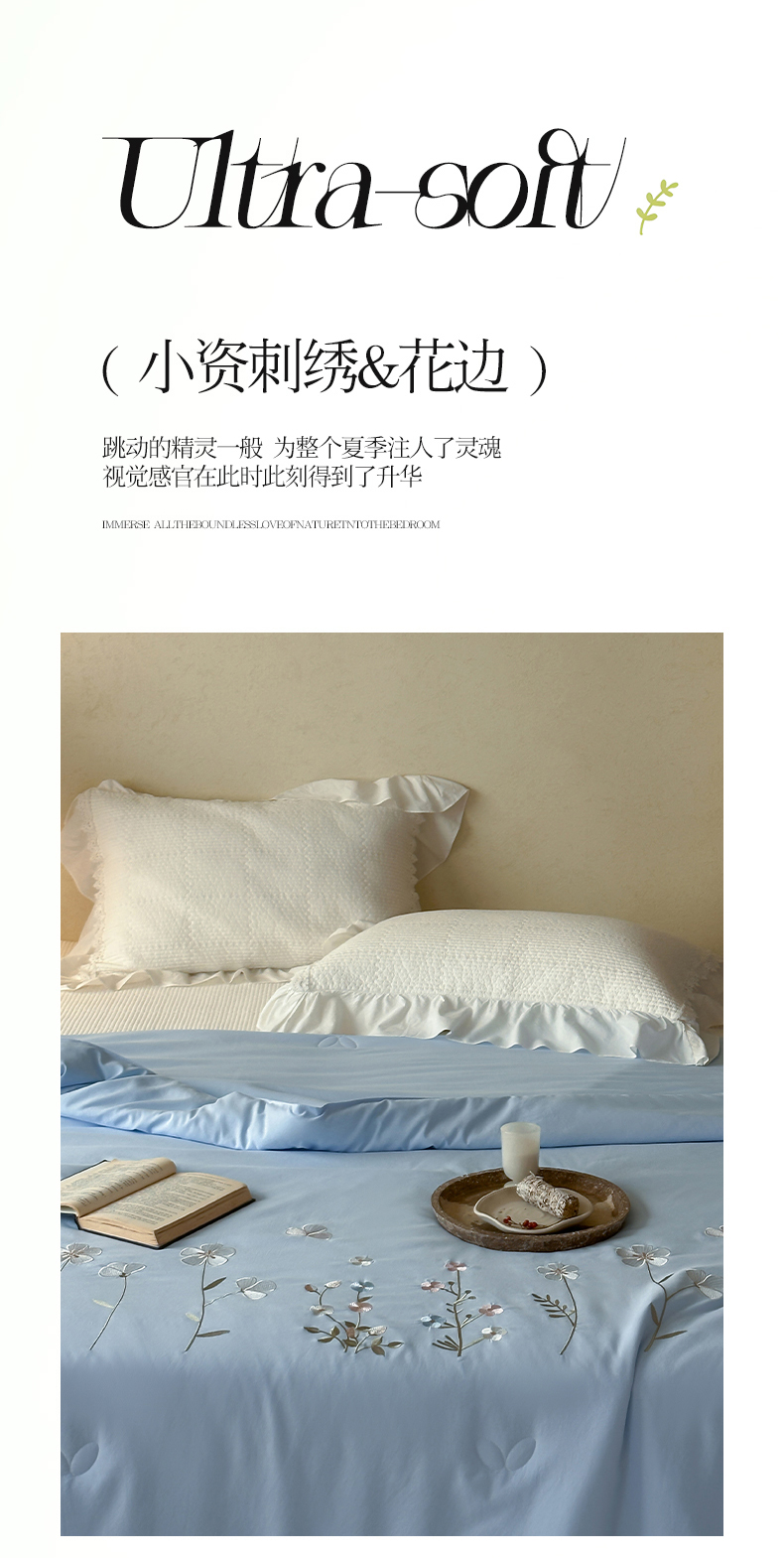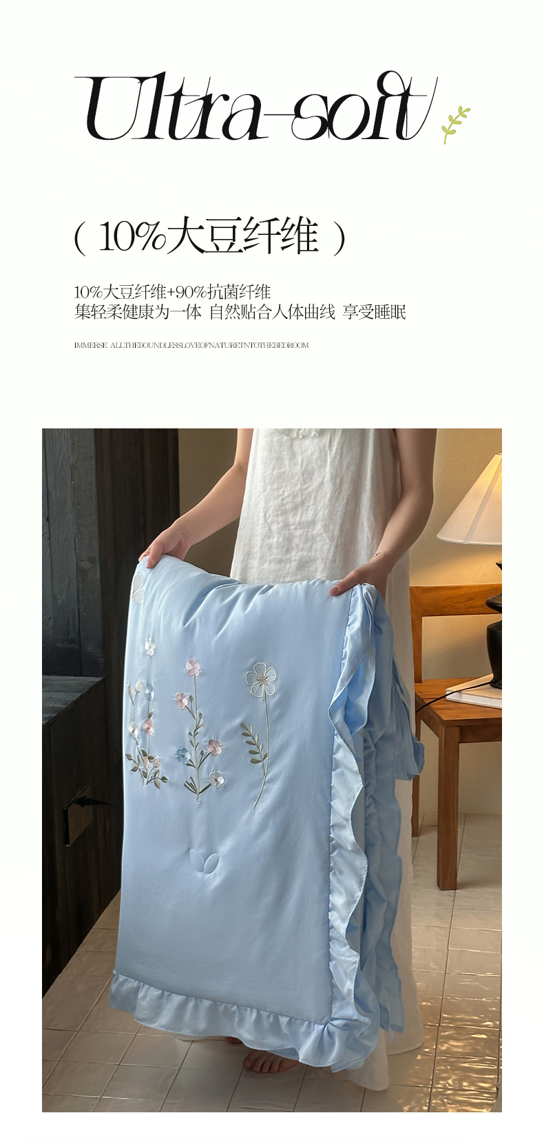 当前位置: 91家纺网 > 商品网购 > 被子 > 夏被 > 一加一 2026新款亲肤凉感花边绣花大豆夏被夏凉被空调被四件套-花间序 花间序-蓝