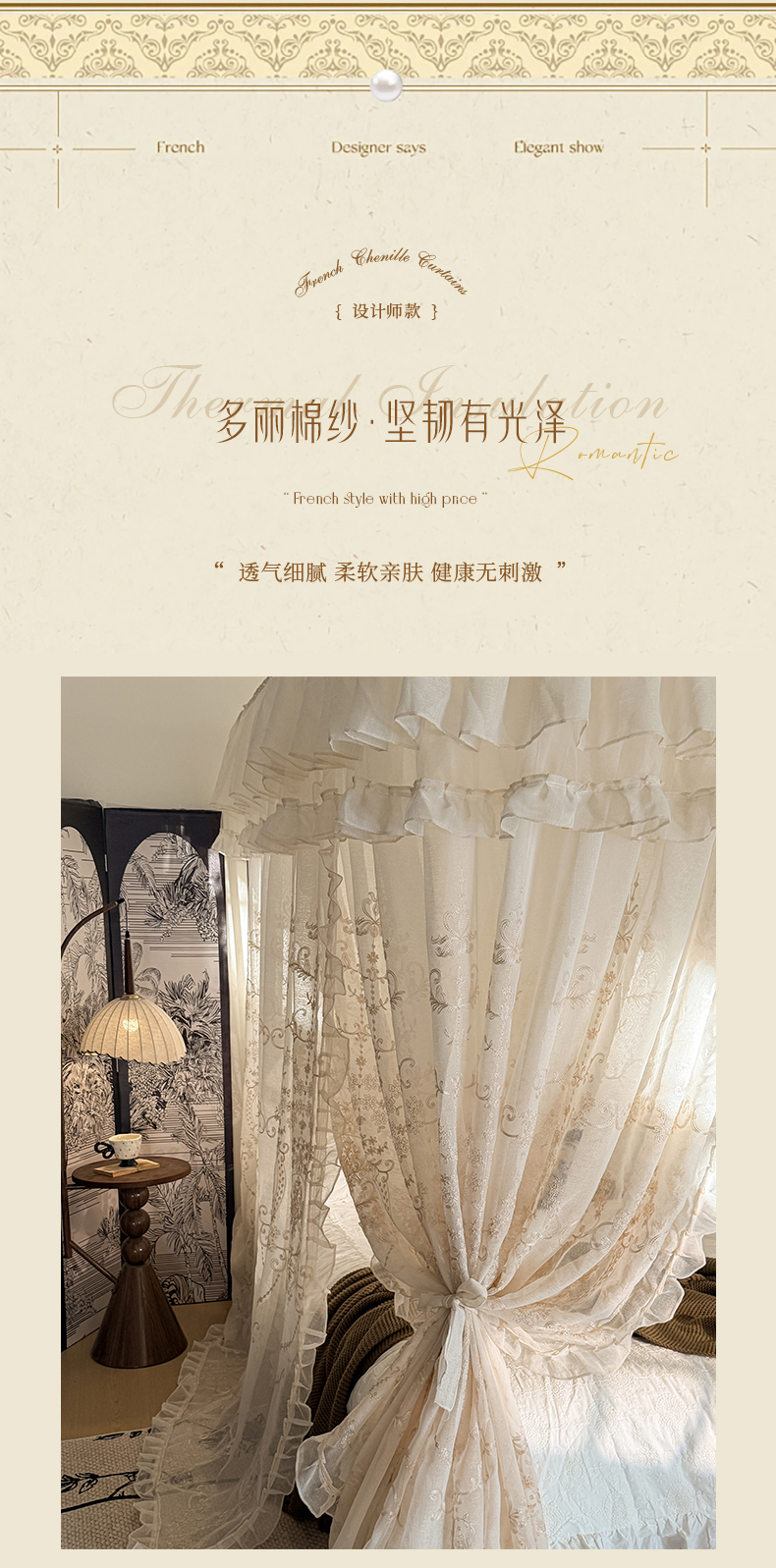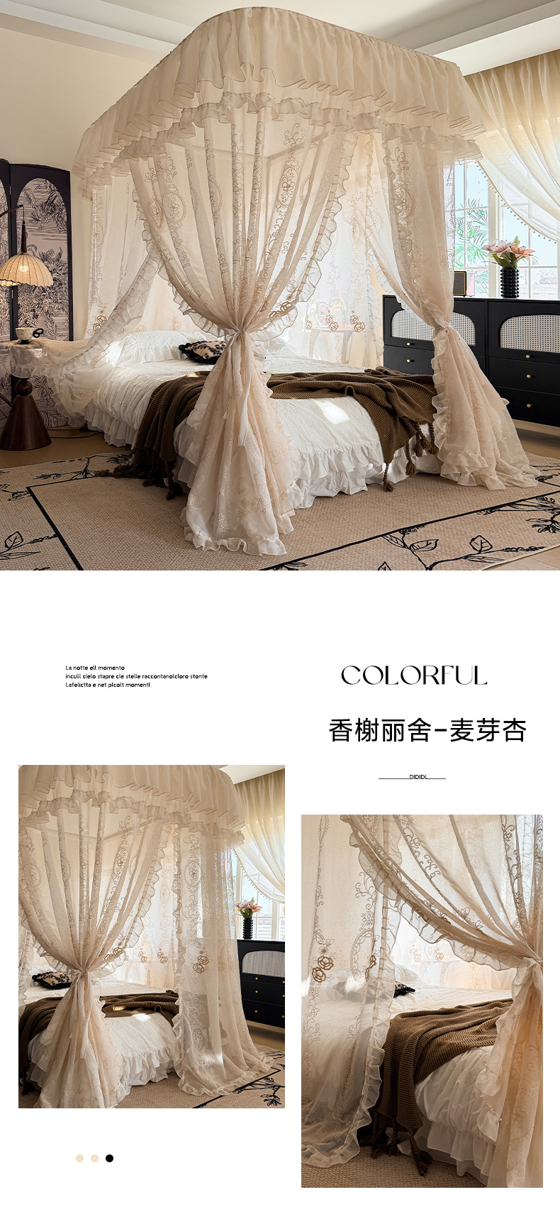 当前位置: 91家纺网 > 商品网购 > 床上用品 > 蚊帐 > 宫廷蚊帐 > 都市缘蚊帐 2026年新款3303多丽棉绣花工艺导轨宫廷蚊帐 3303南法假日-麦芽杏
