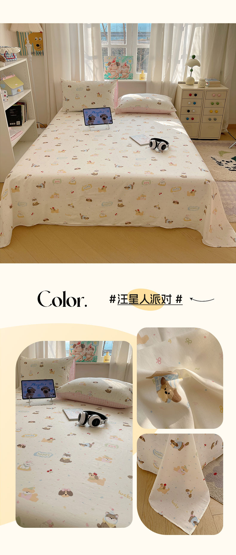 六巷胡同 2026新款40支全棉13070INS卡通全棉单品床单 猫狗游园会