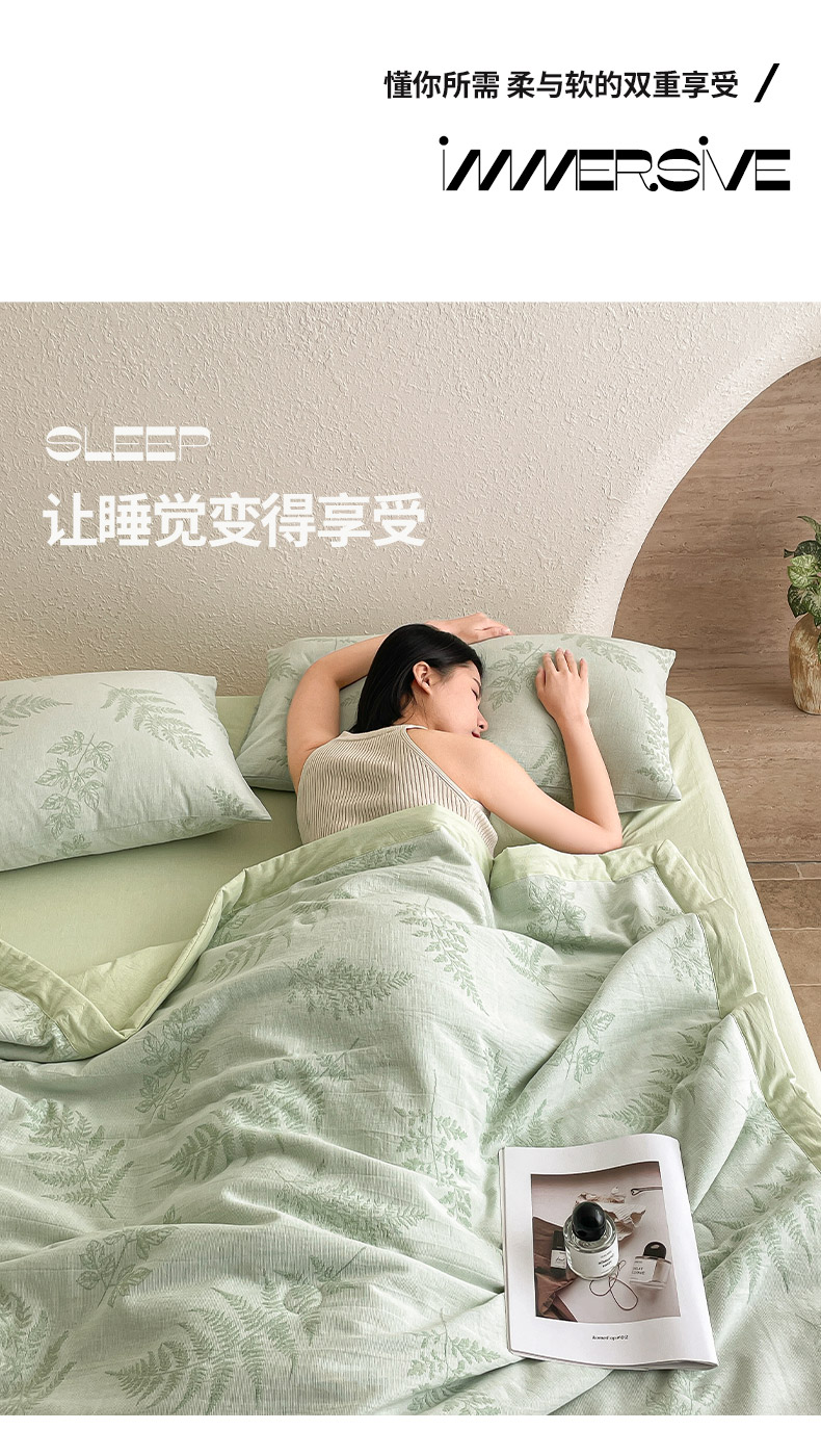 • 91家纺网 家纺一手货源 找家纺 吾秀家居 2026新款全棉色织提花三层纱夏被夏凉被空调被-华美 花影-绿