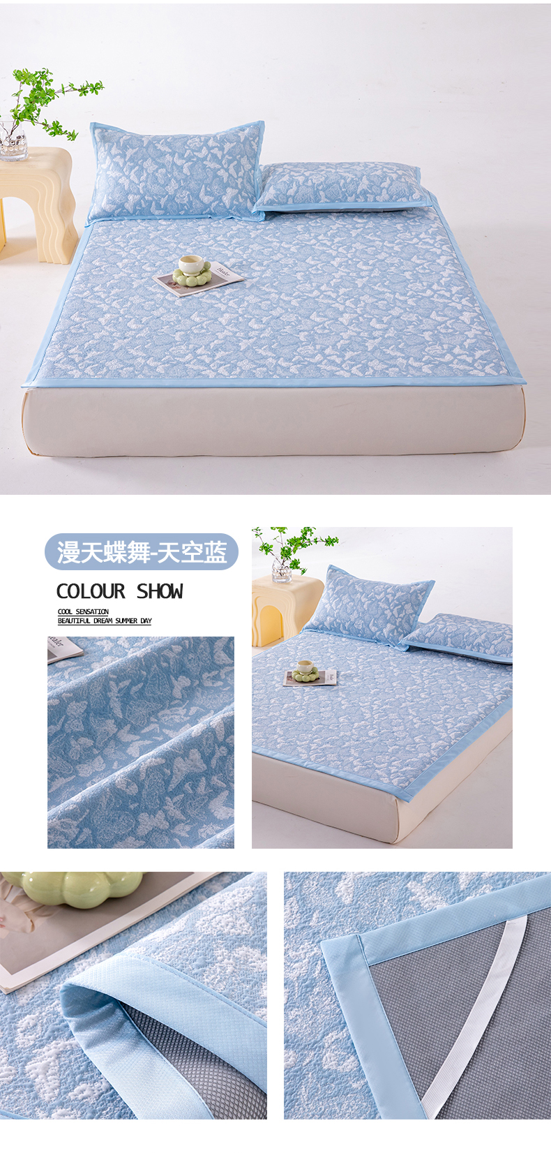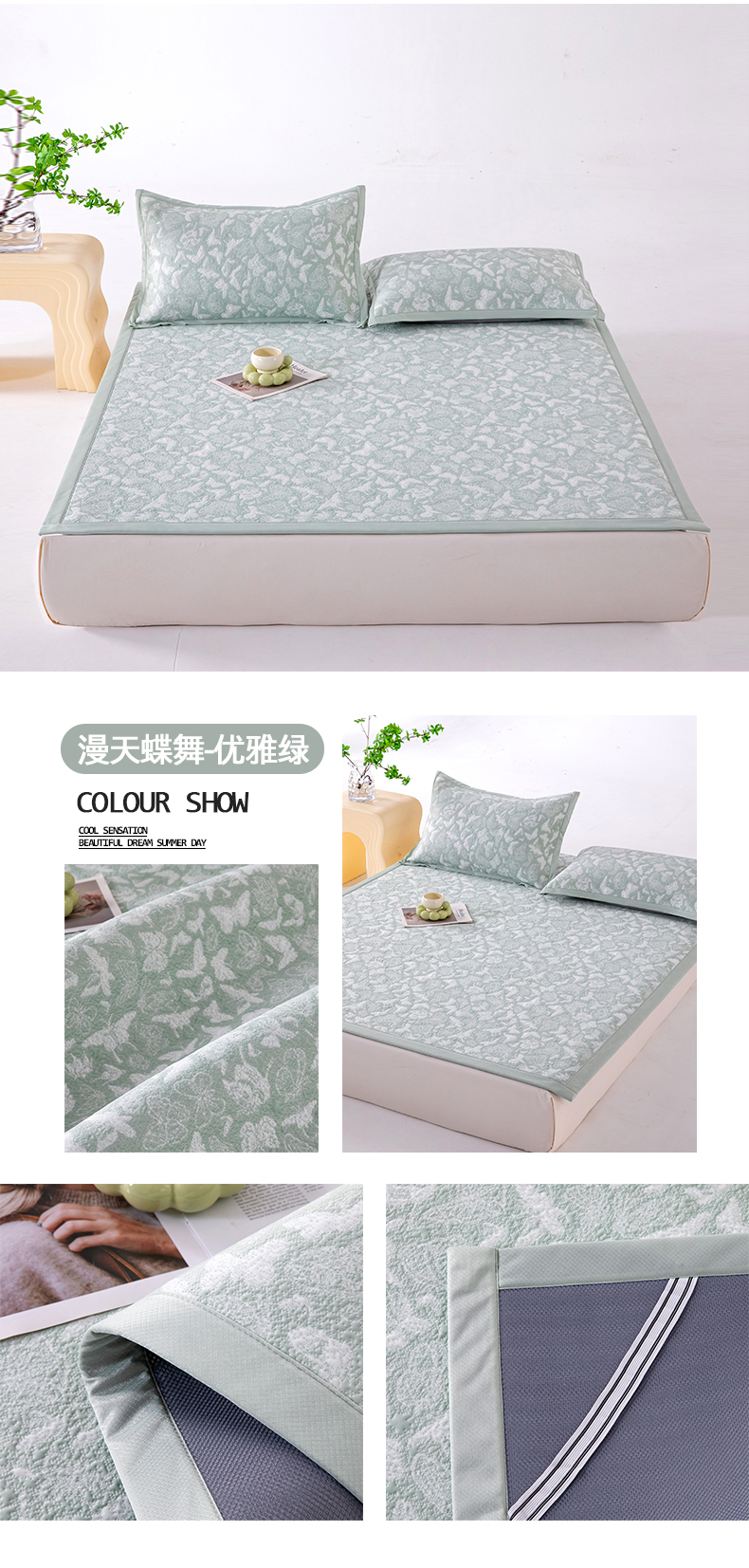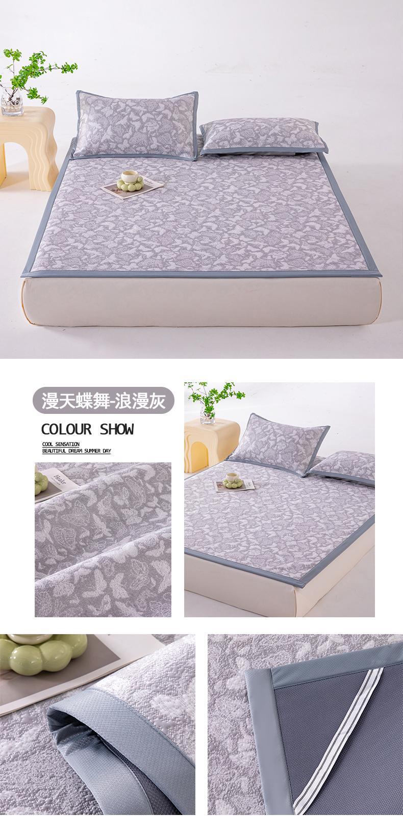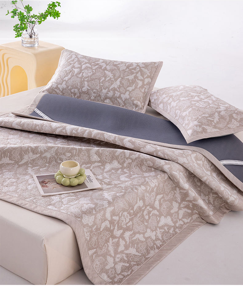 • 91家纺网 家纺一手货源 找家纺 (总)卡初家居(原微来) 2026新款A类凉感冰豆豆双面提花席-漫天蝶舞,漫天蝶舞-浪漫灰,漫天蝶舞-柔和粉,漫天蝶舞-天空蓝,漫天蝶舞-香槟金,漫天蝶舞-优雅绿