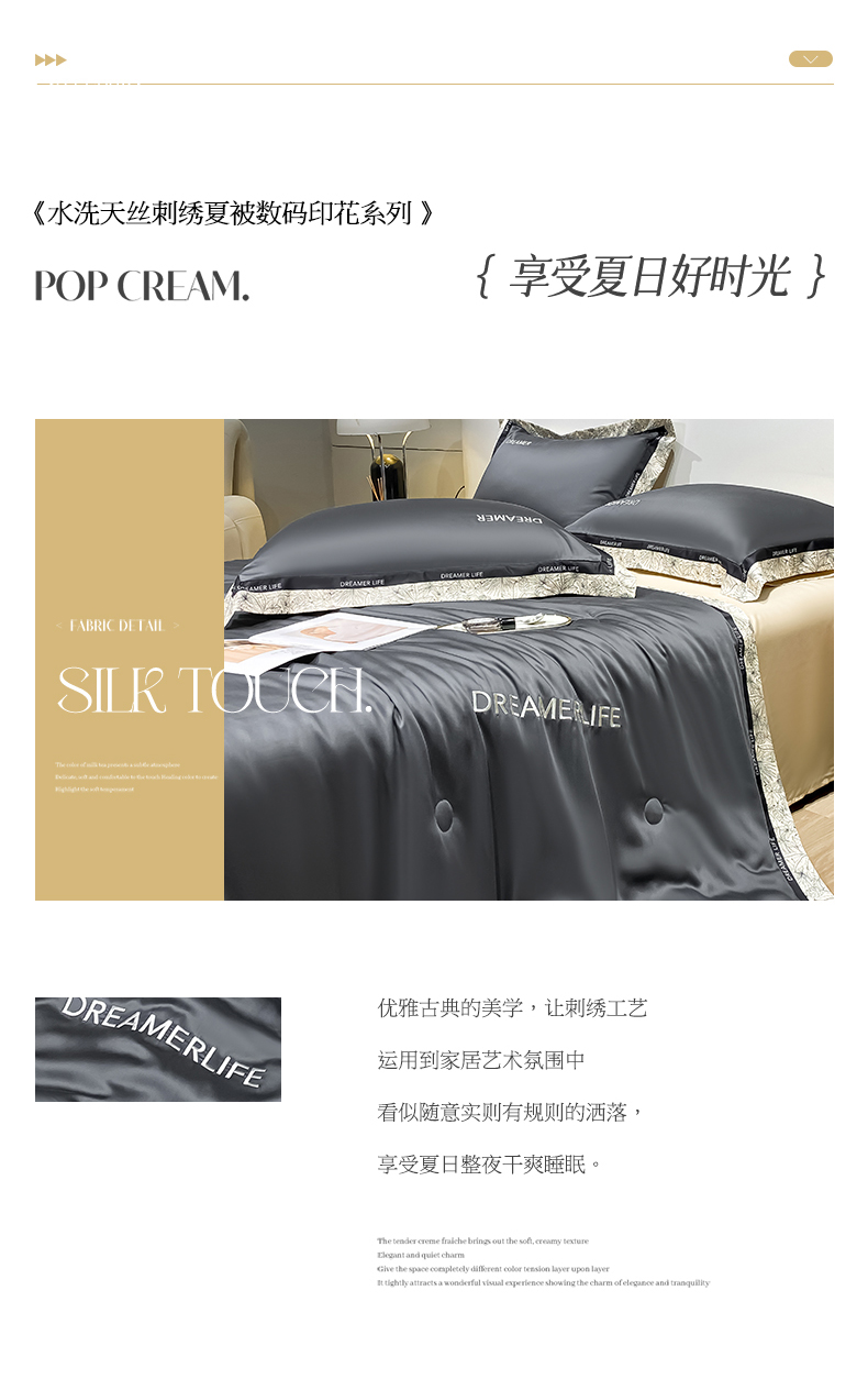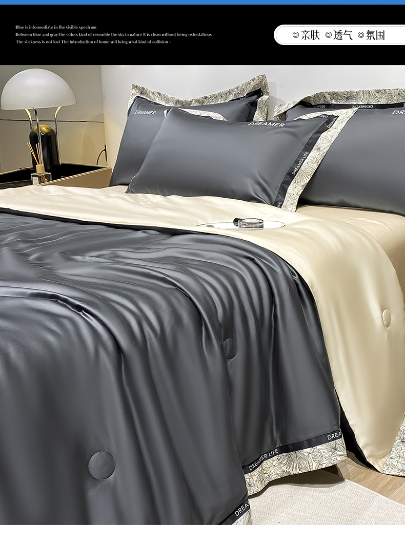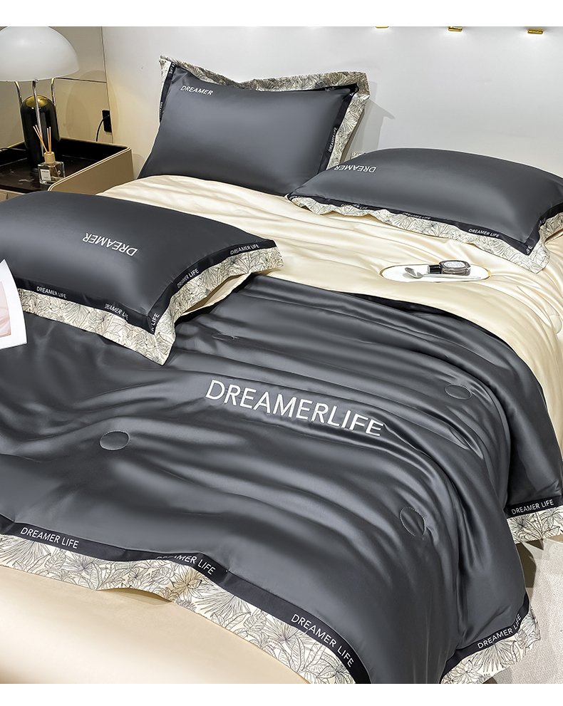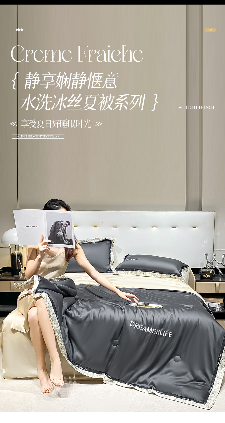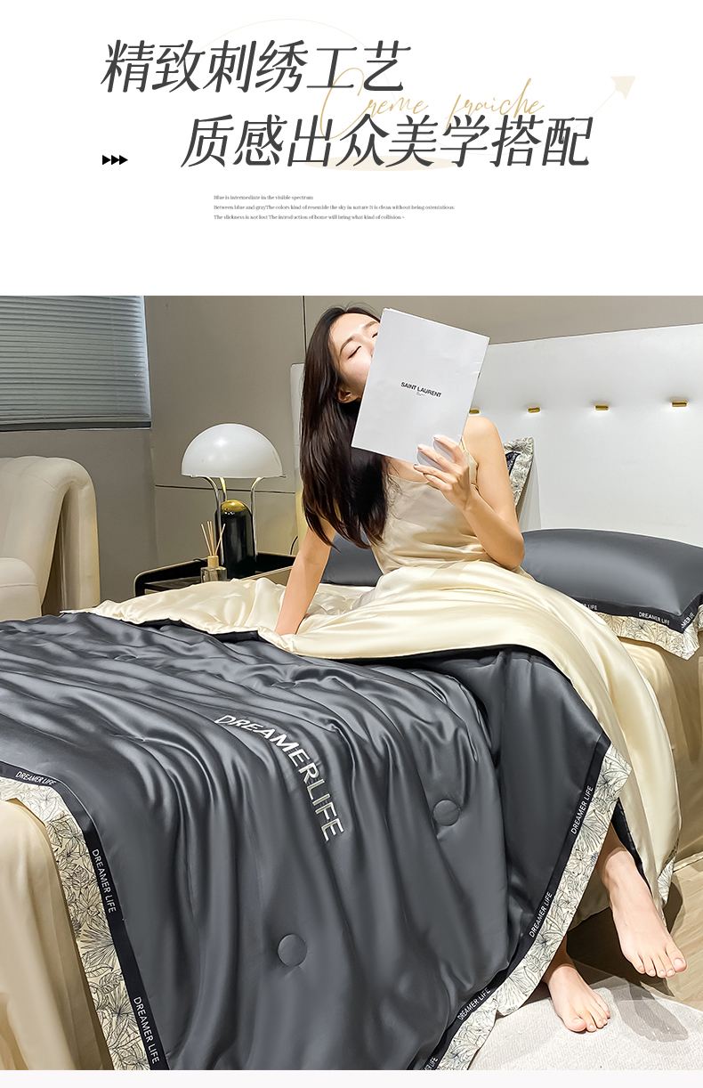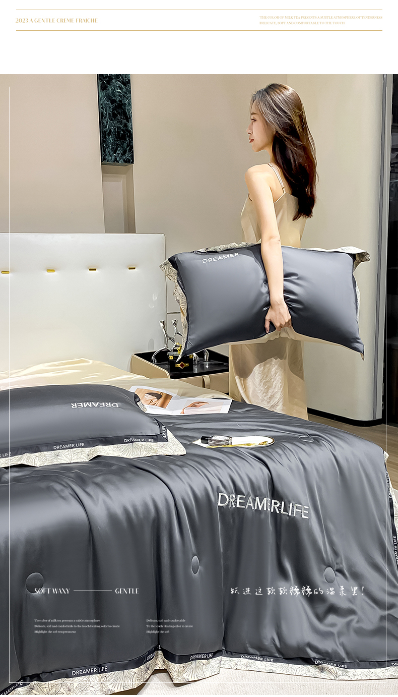 • 91家纺网 家纺一手货源 找家纺 眷恋家纺 2026新款水洗真丝冰丝宽边刺绣夏被三件套四件套-克里斯汀系列 克里斯汀-高级灰+奶茶