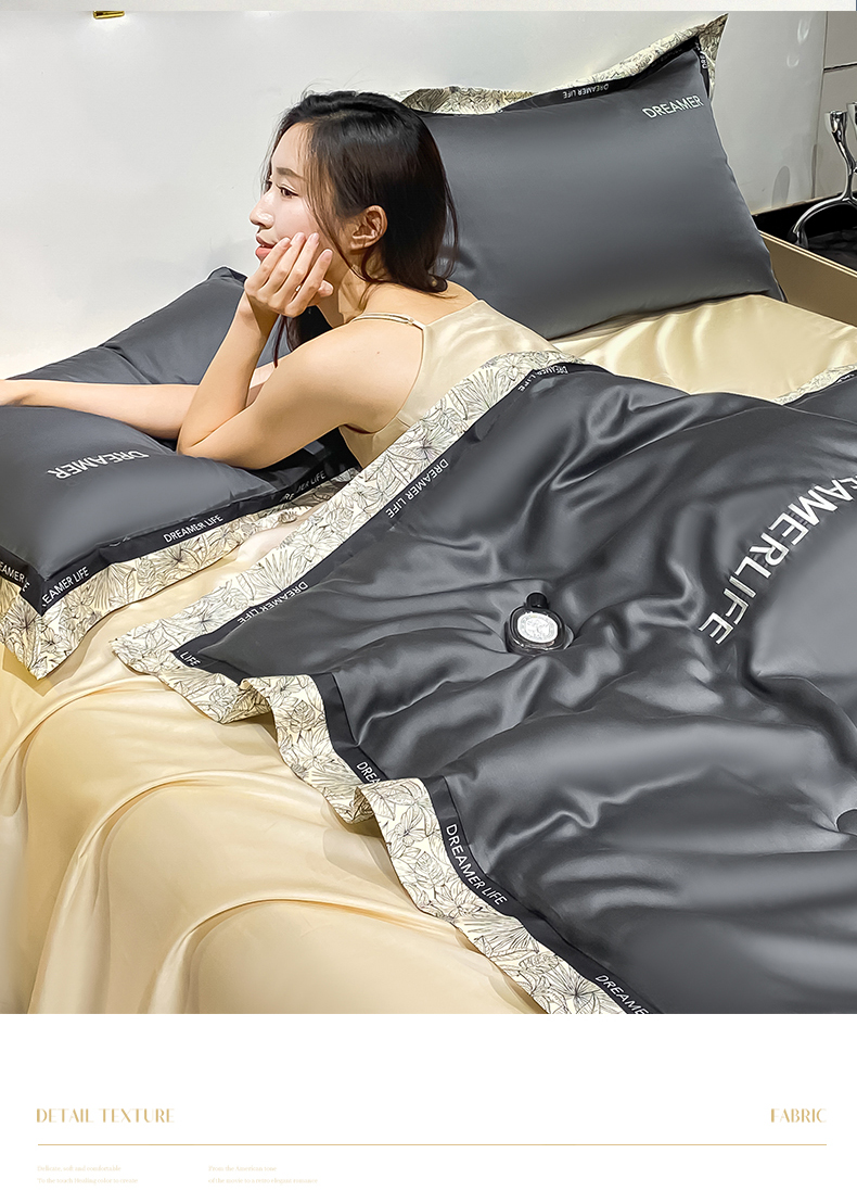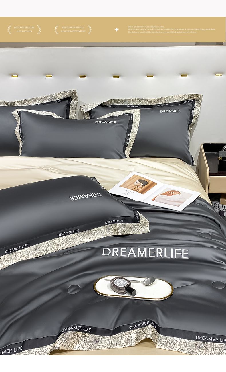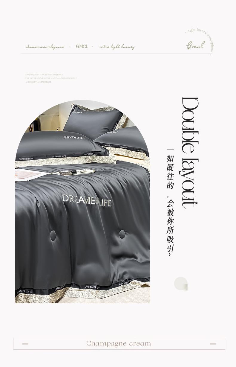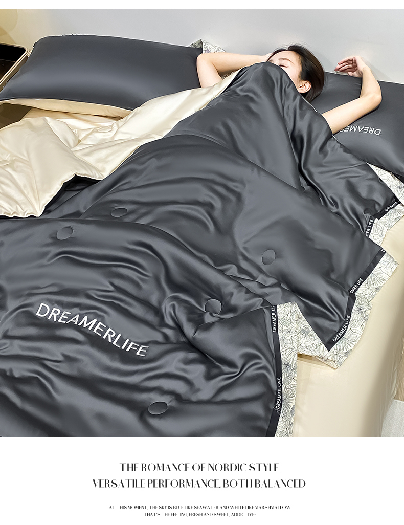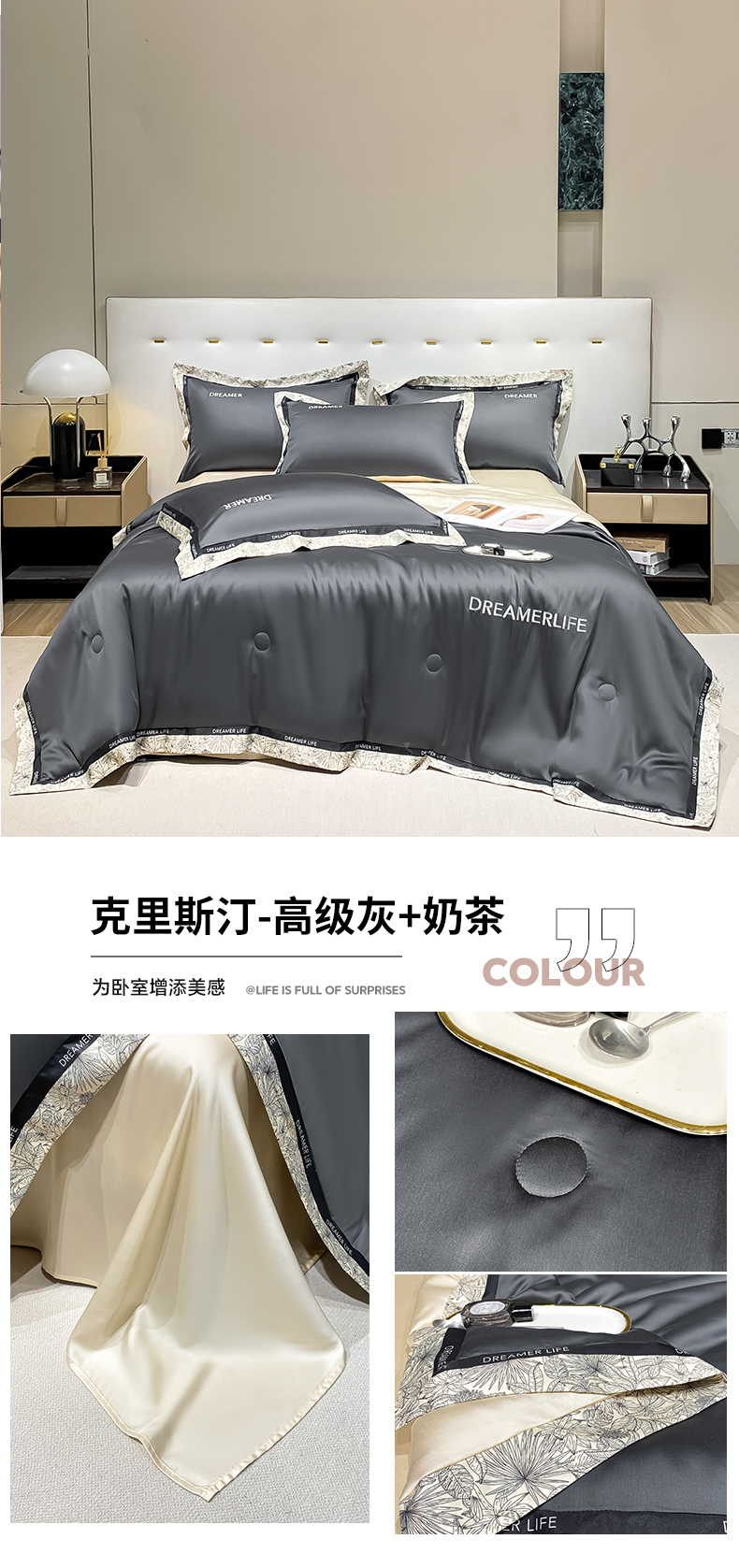 • 91家纺网 家纺一手货源 找家纺 眷恋家纺 2026新款水洗真丝冰丝宽边刺绣夏被三件套四件套-克里斯汀系列 克里斯汀-高级灰+奶茶
