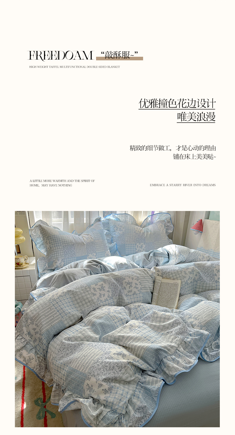 (总)睡美美家纺 2026新款皱皱纱肤感花边四件套,百福蓝,绿野,梦境织格,摩卡樱桃,桃乐丝,夭夭,莹光,旧梦蔷薇,紫风铃