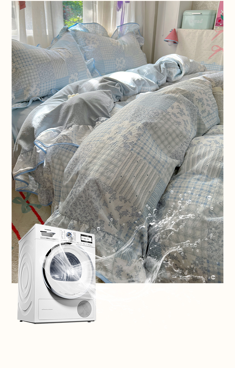(总)睡美美家纺 2026新款古法水洗贴布格纹碎花云朵棉四件套-格纹小碎花,格纹小碎花--奶黄,格纹小碎花--浅咖,格纹小碎花--青柠,格纹小碎花--晴蓝,格纹小碎花--柔粉
