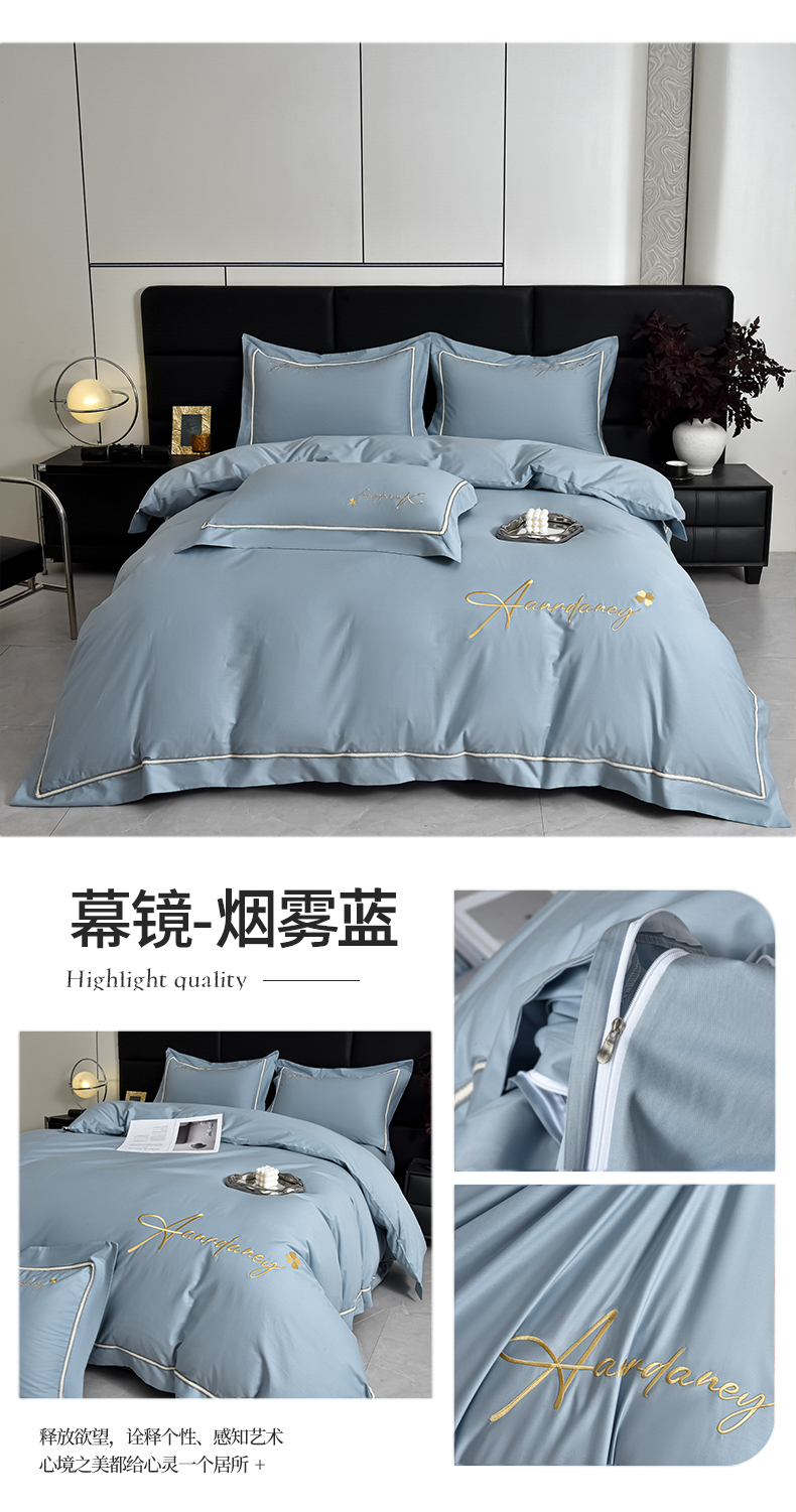 商品名称:湘雪家居 2026新款长绒棉高支高密纯棉刺绣四件套-幕镜款 幕镜-烟雾蓝