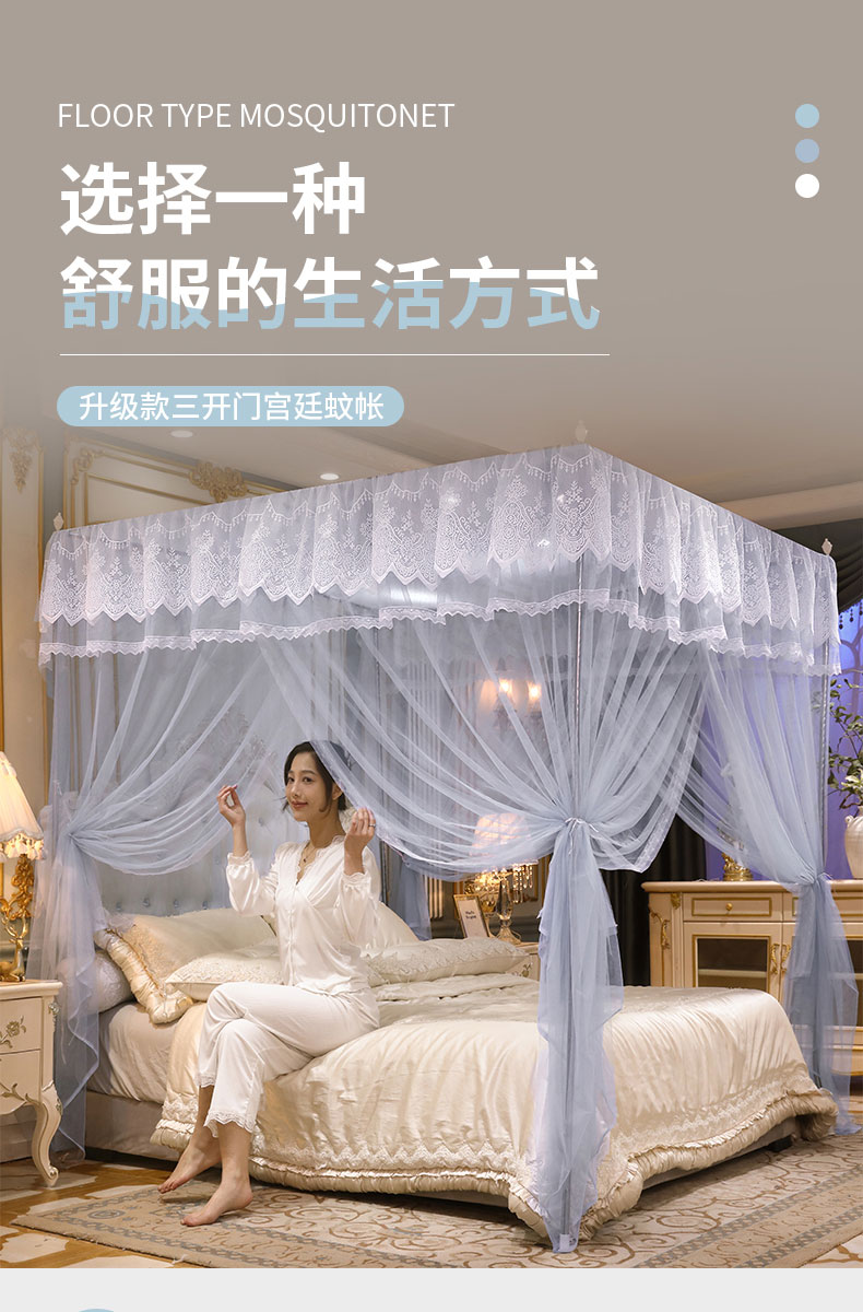 当前位置: 91家纺网 > 商品网购 > 床上用品 > 蚊帐 > 宫廷蚊帐 > 永旺家纺 2026新款宫廷落地三门开蚊帐--春暖花开 雾霾蓝