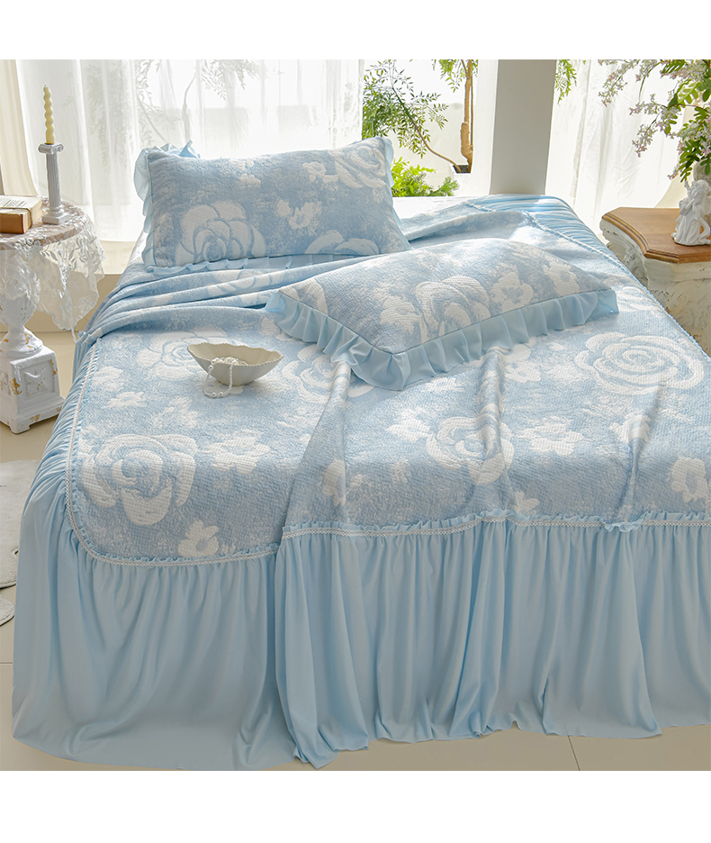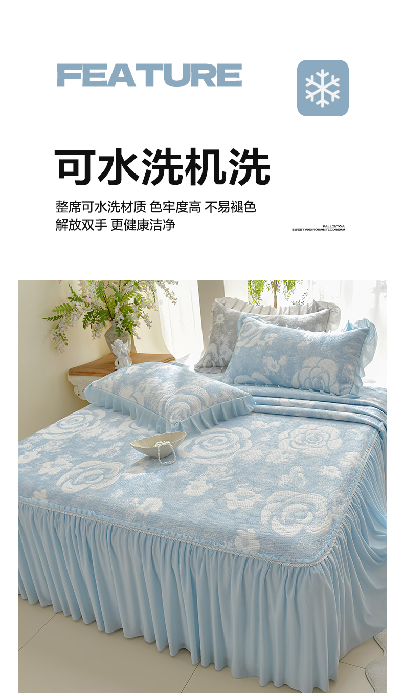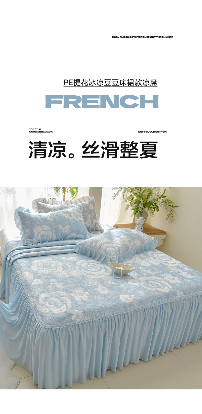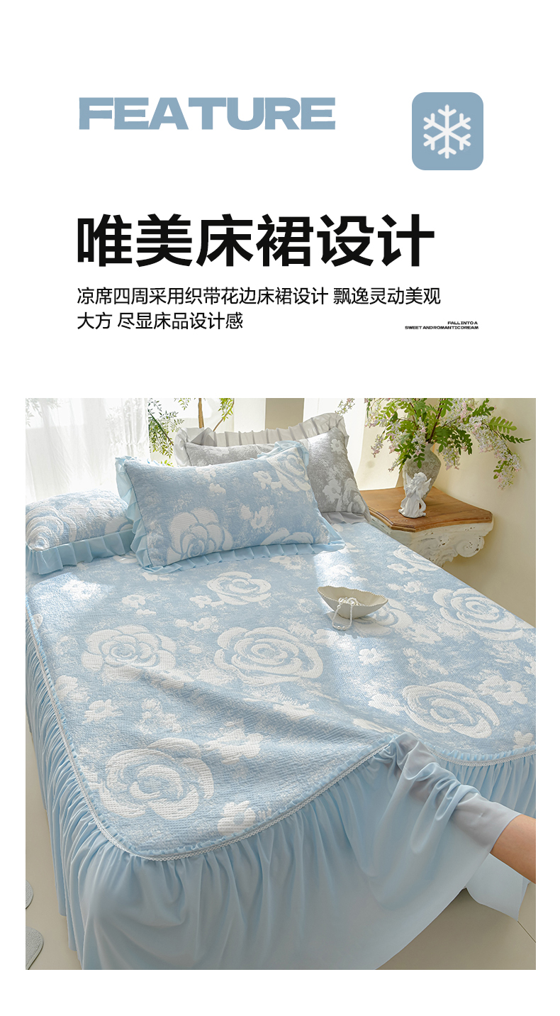 商品名称:绘萱家居 2026春夏新款530克PE100%提花冰凉豆豆床裙款凉席席子空调软席 云裳玫瑰-蓝