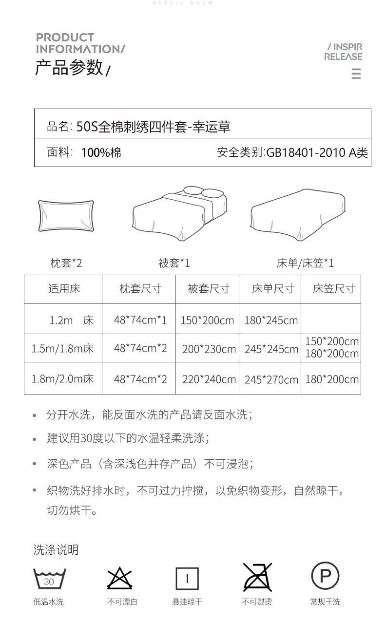 当前位置: 91家纺网 > 商品网购 > 床品套件 > 四件套 > 全棉普通四件套 > 佳汐蓝家纺 2026新款50S全棉纯棉轻奢工艺款精致刺绣四件套-幸运草系列 幸运草-云母白