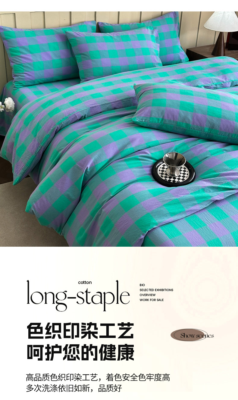 • 91家纺网 家纺一手货源 找家纺 (总)蓝梦 2026新款全棉纯棉色织水洗棉简约四件套-大格,艾格绿,鹅黄,可可灰,蓝粉格,桃粉,优雅兰,宝利格