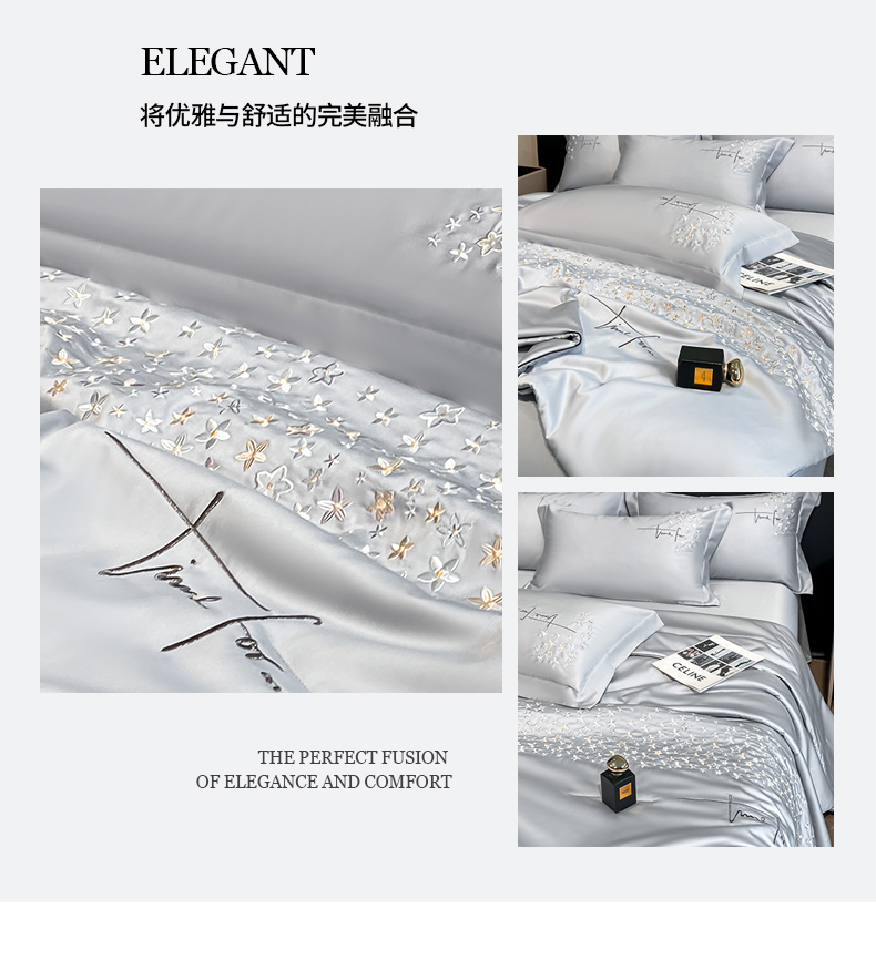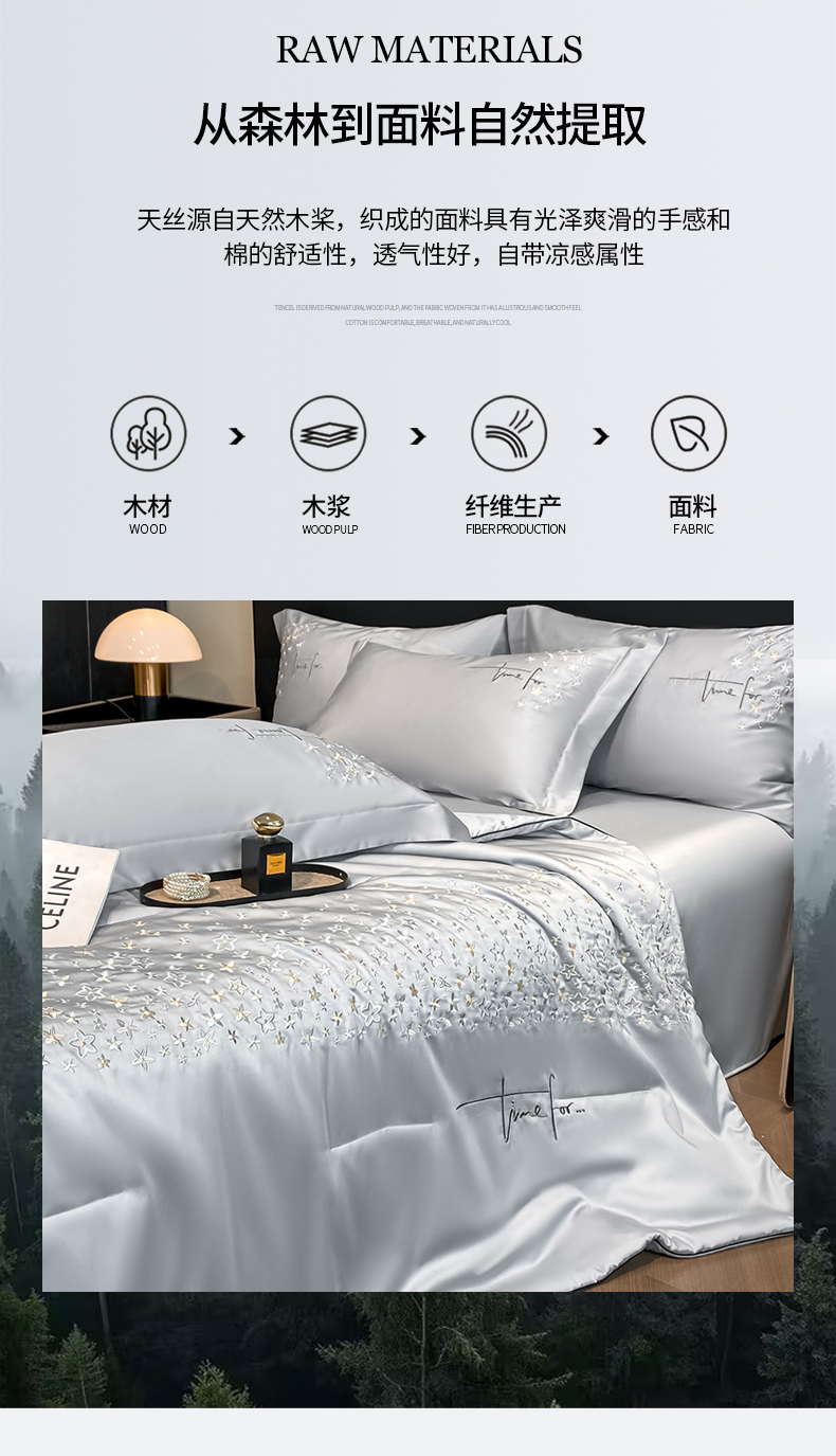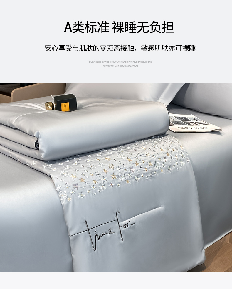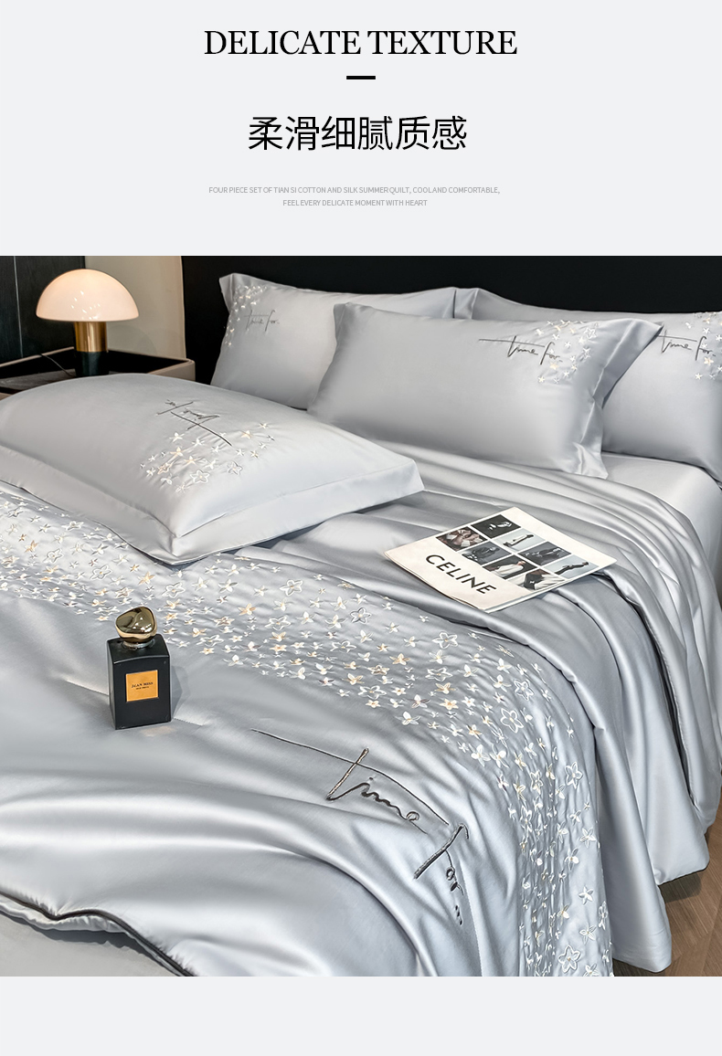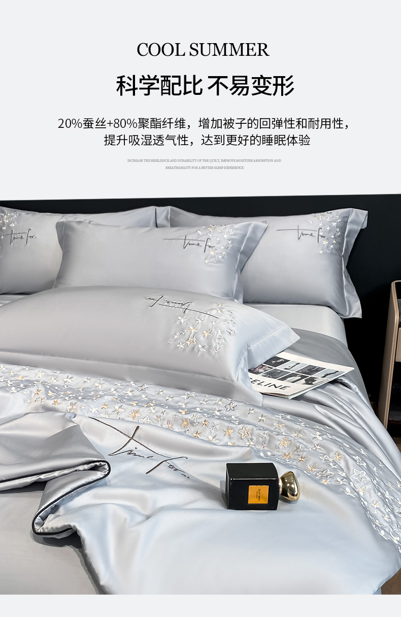 当前位置: 91家纺网 > 商品网购 > 床品套件 > 四件套 > 夏被四件套 > (总)新方向 2026刺绣A类20%蚕丝天丝棉夏被四件套 65%60s兰精天丝 35%100支长绒棉-星耀