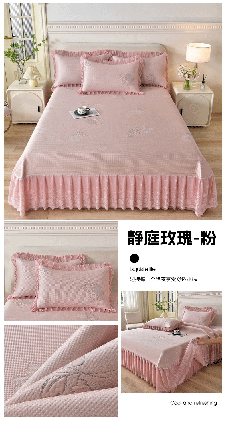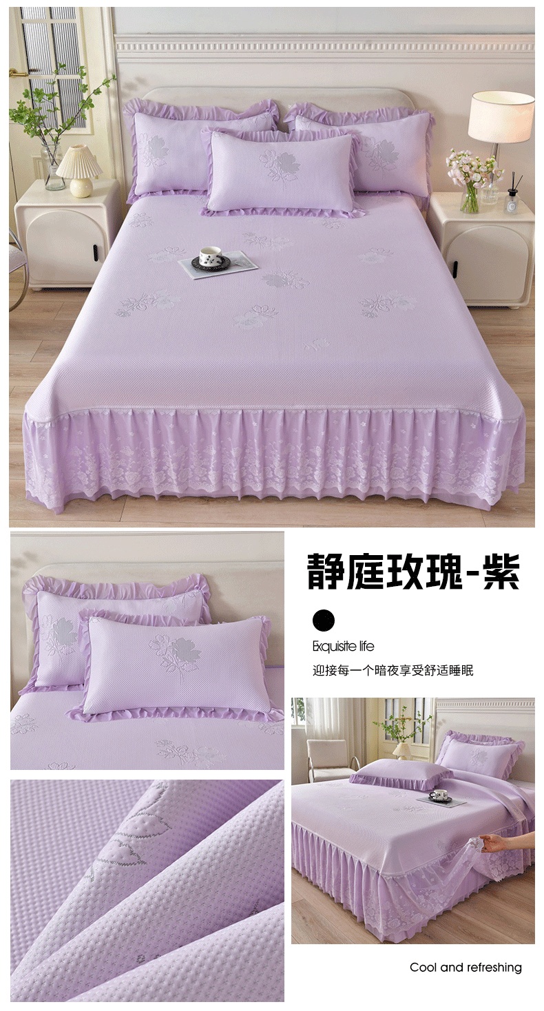 (总)绒耀家纺 直播新款加厚复合冰豆豆PE高分子凉感丝双面提花凉席三件套双层花边(控价最低139起),静庭玫瑰-粉,静庭玫瑰-绿,静庭玫瑰-紫,静庭玫瑰-灰,静庭玫瑰-蓝,静庭玫瑰-白