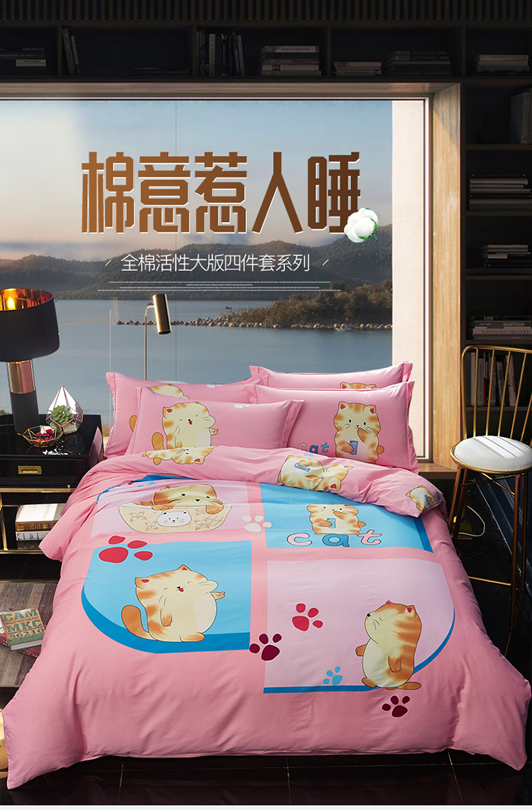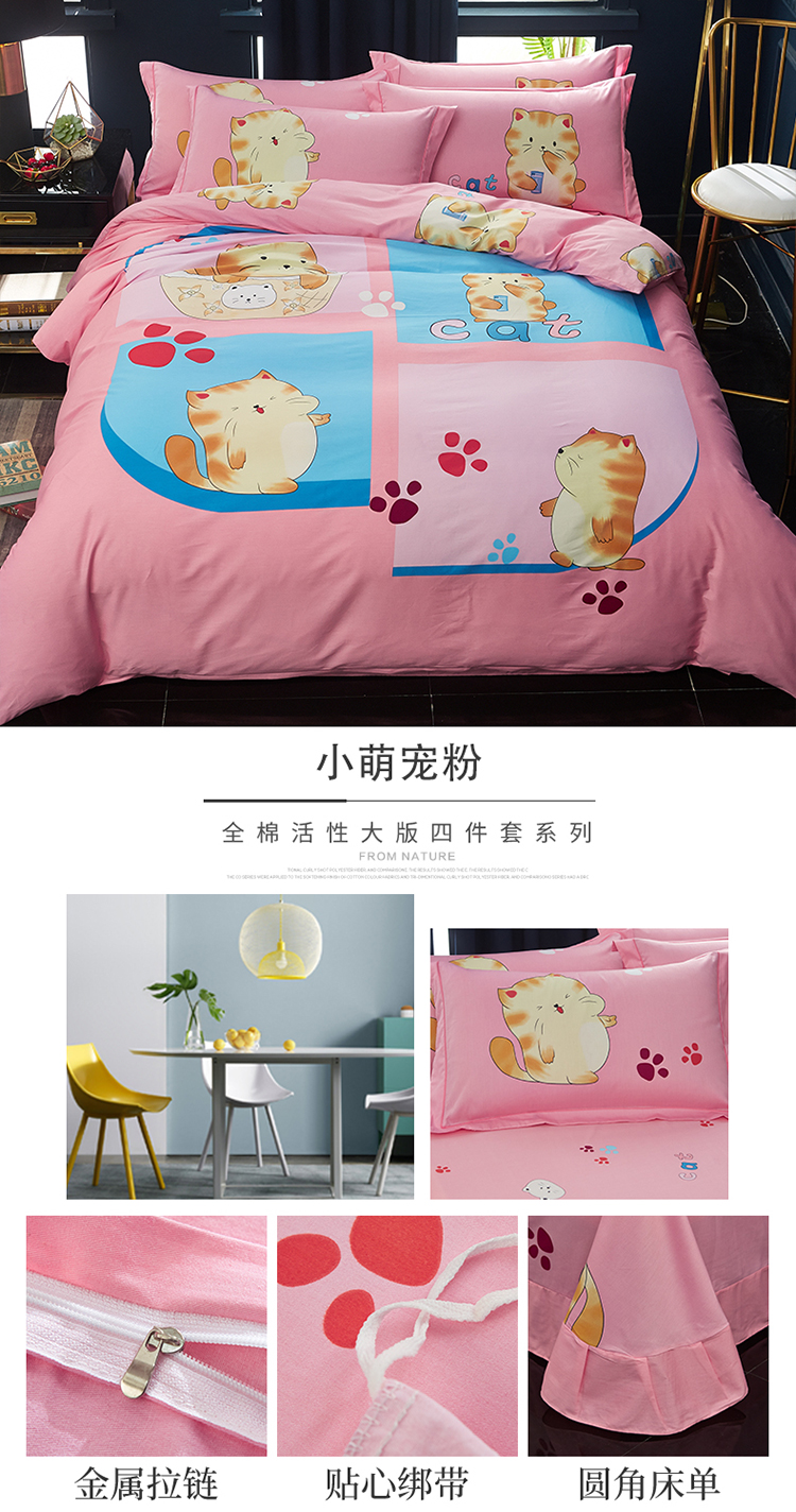 雲归梦 2019全棉活性大版简约卡通风格四件套 小萌宠粉