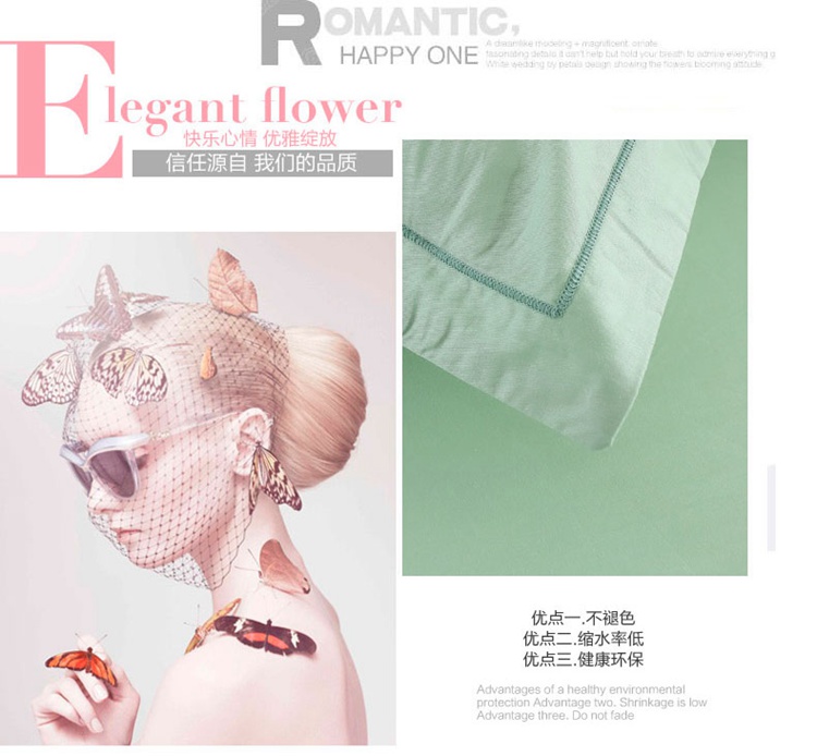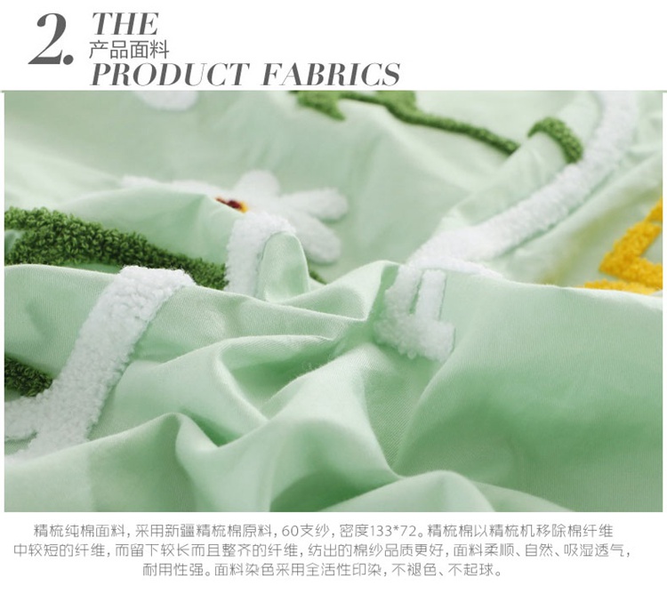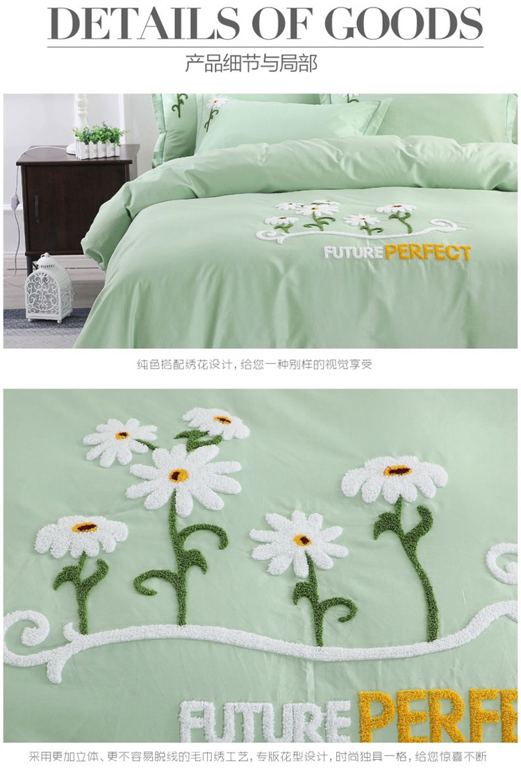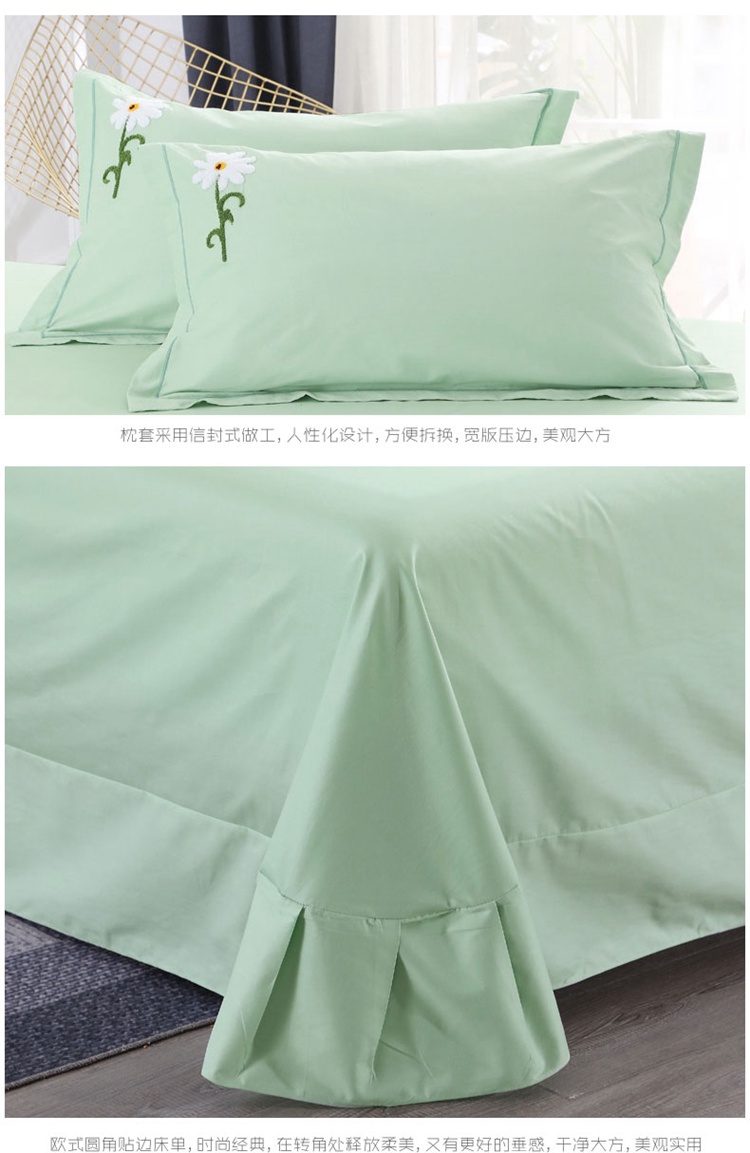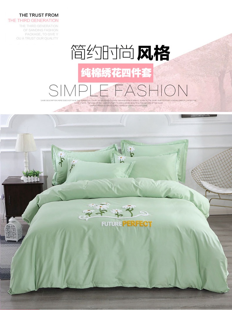 全棉133*72纯色绣花四件套,采用新疆精梳棉,60支纱,密度133*72。专版绣花花型设计,高精度、高密度立体毛巾绣工艺,相比普通绣花更加牢固不易脱线,美观又耐用。