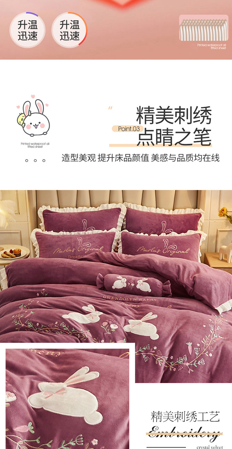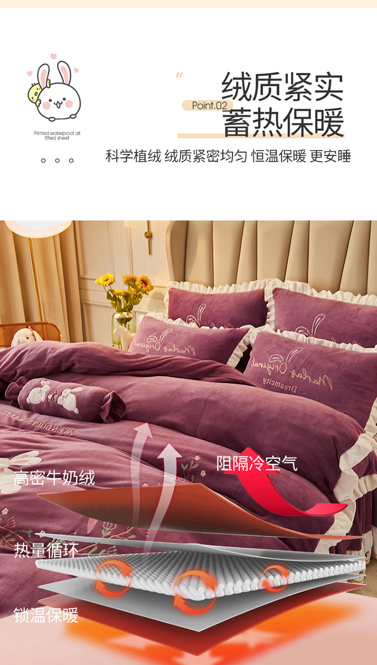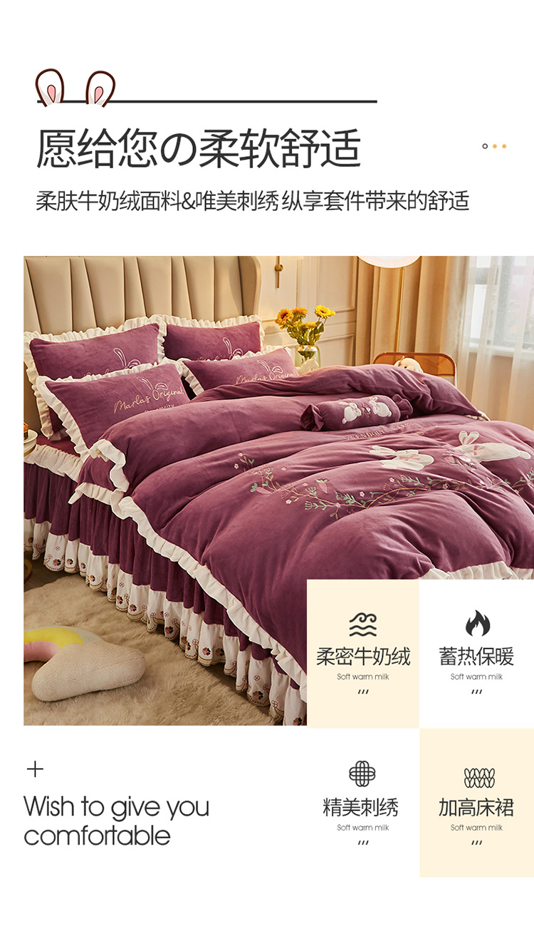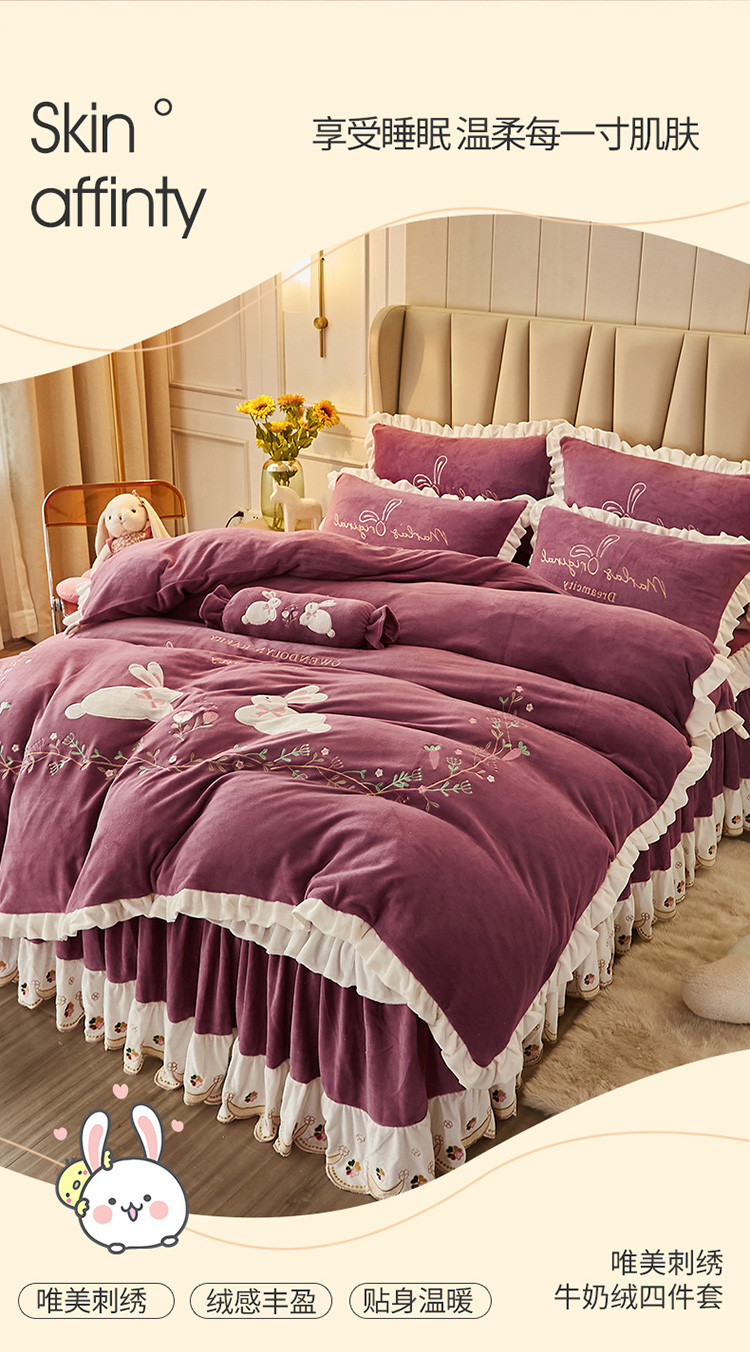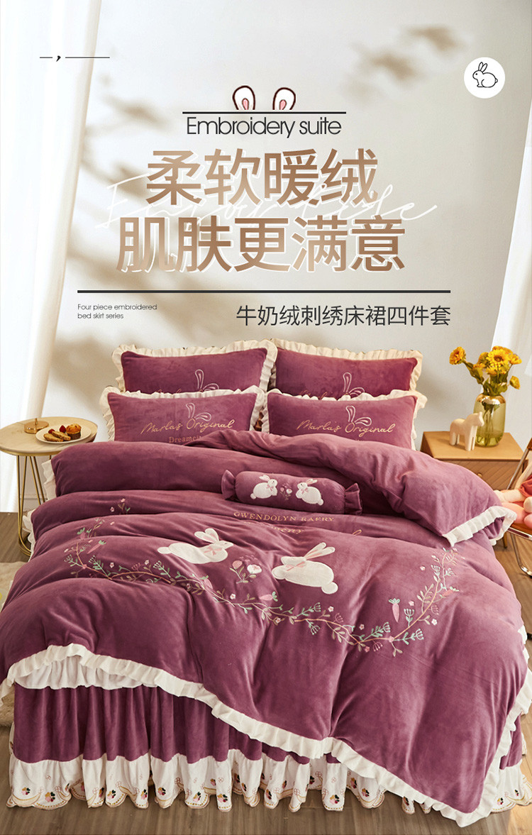 宜凡 2021新款牛奶绒绣花兔床裙四件套 萌萌兔-烟紫