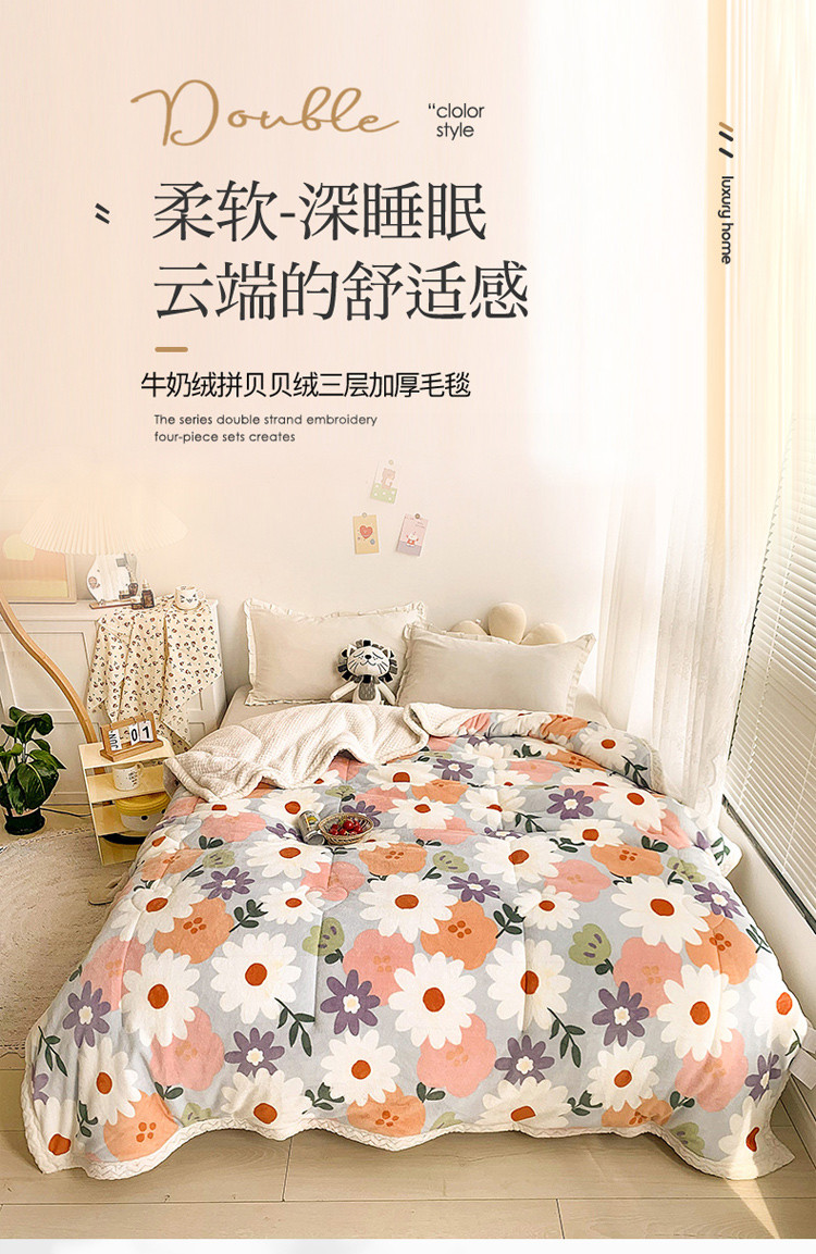 慕尚家纺2022新款牛奶绒贝贝绒三层加厚毛毯加厚毯-花海
