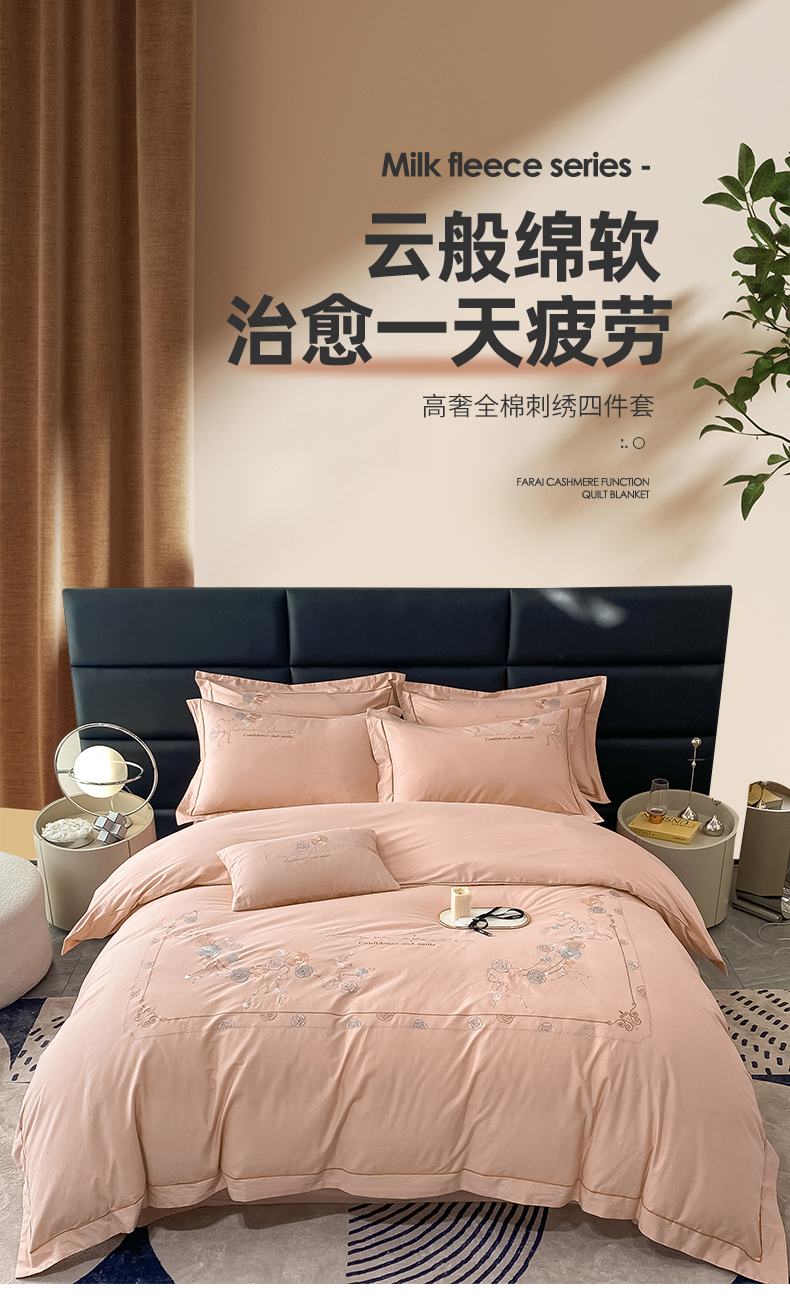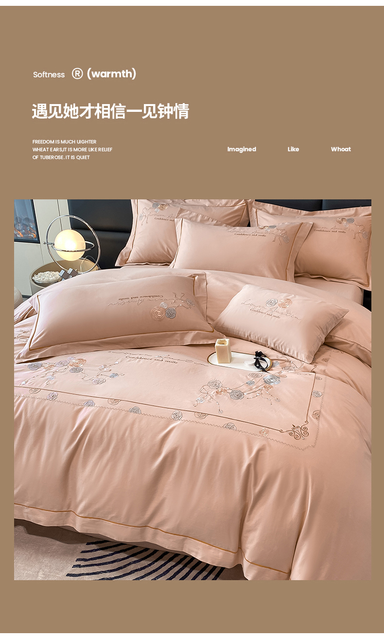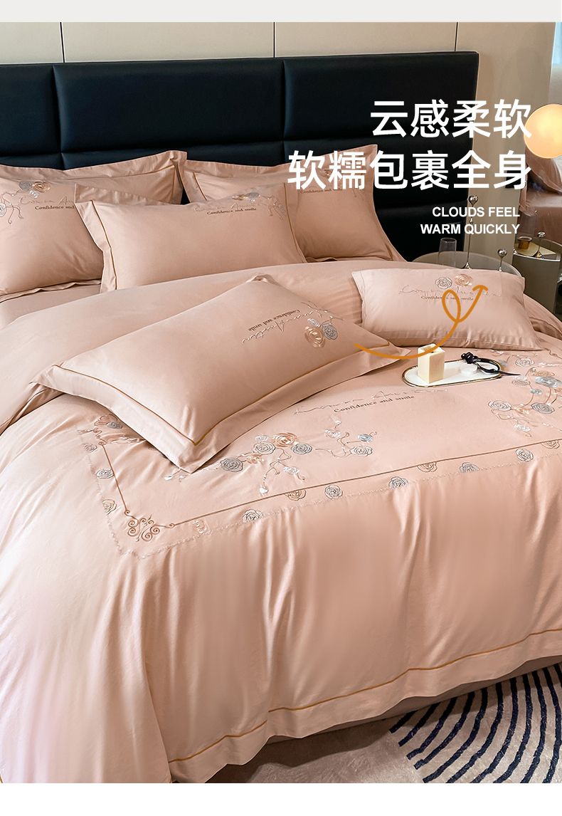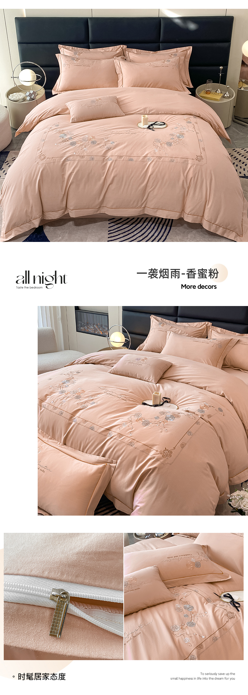 商品名称:绒世界2024新款全棉刺绣烟雨系列四件套 一袭烟雨-香蜜粉