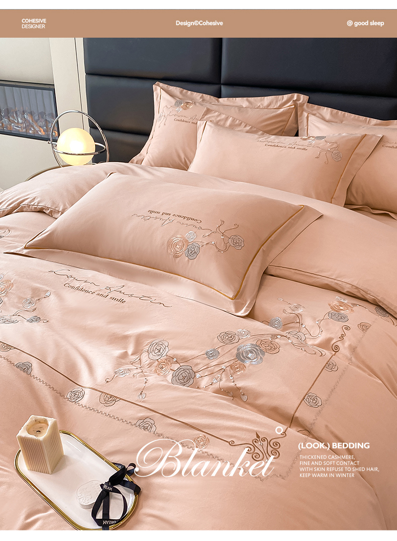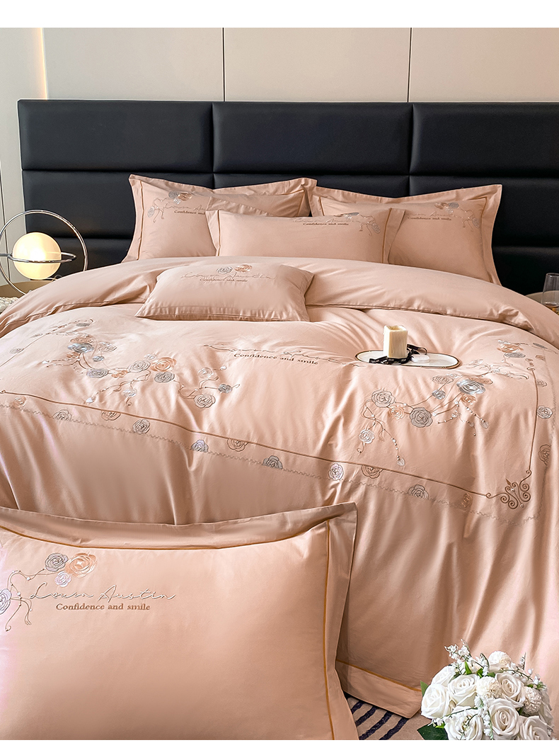 绒世界2024新款全棉刺绣烟雨系列四件套 一袭烟雨-香蜜粉