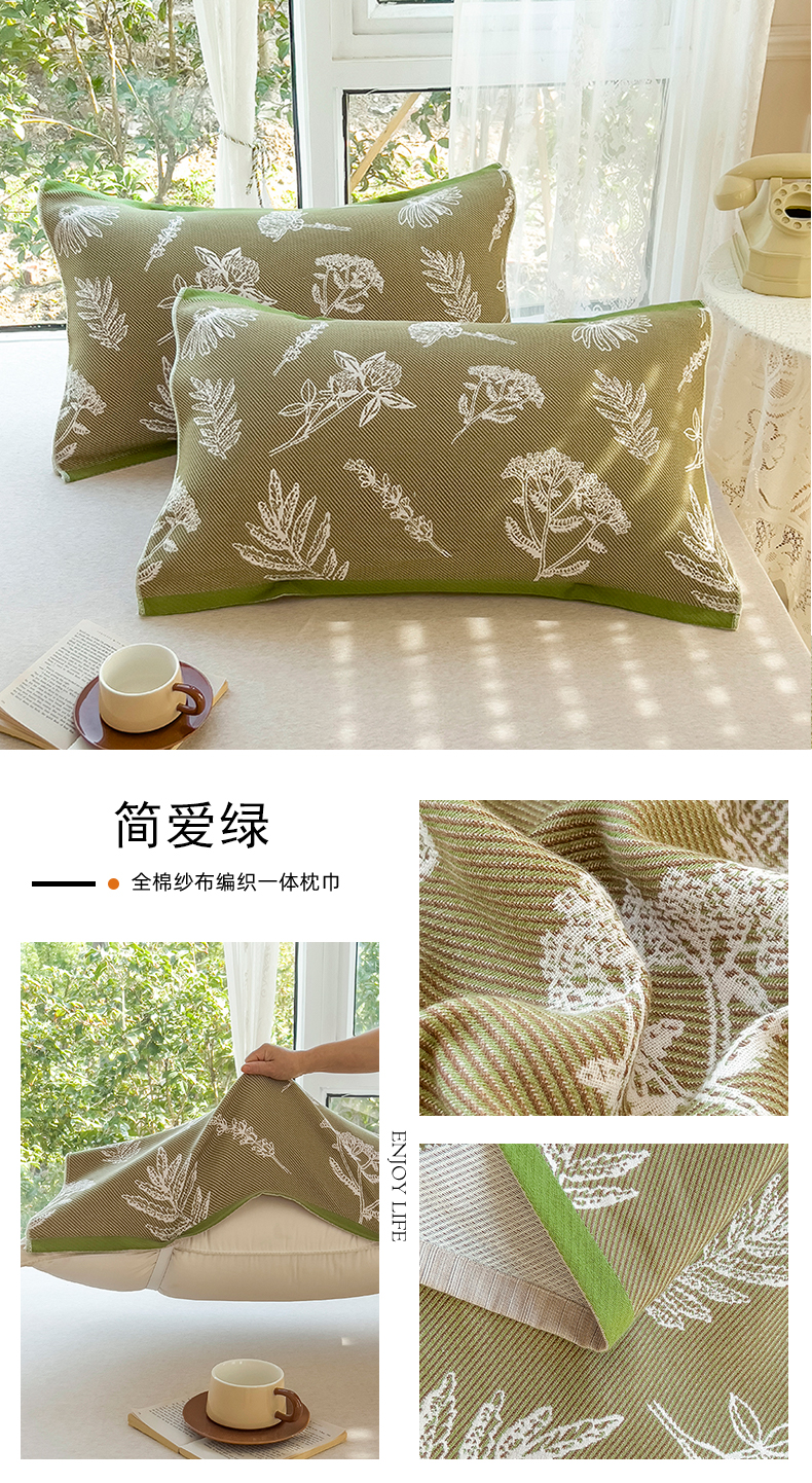棠薇全棉四层斜纹编织一体不分层松紧绑带枕巾纯棉枕头巾一对 简爱绿普通无绑带款