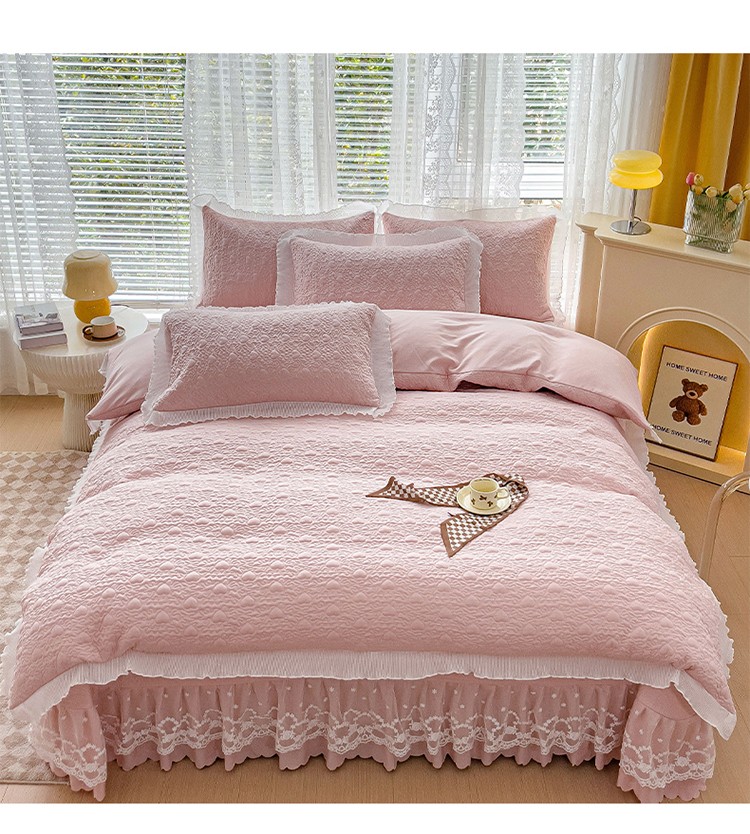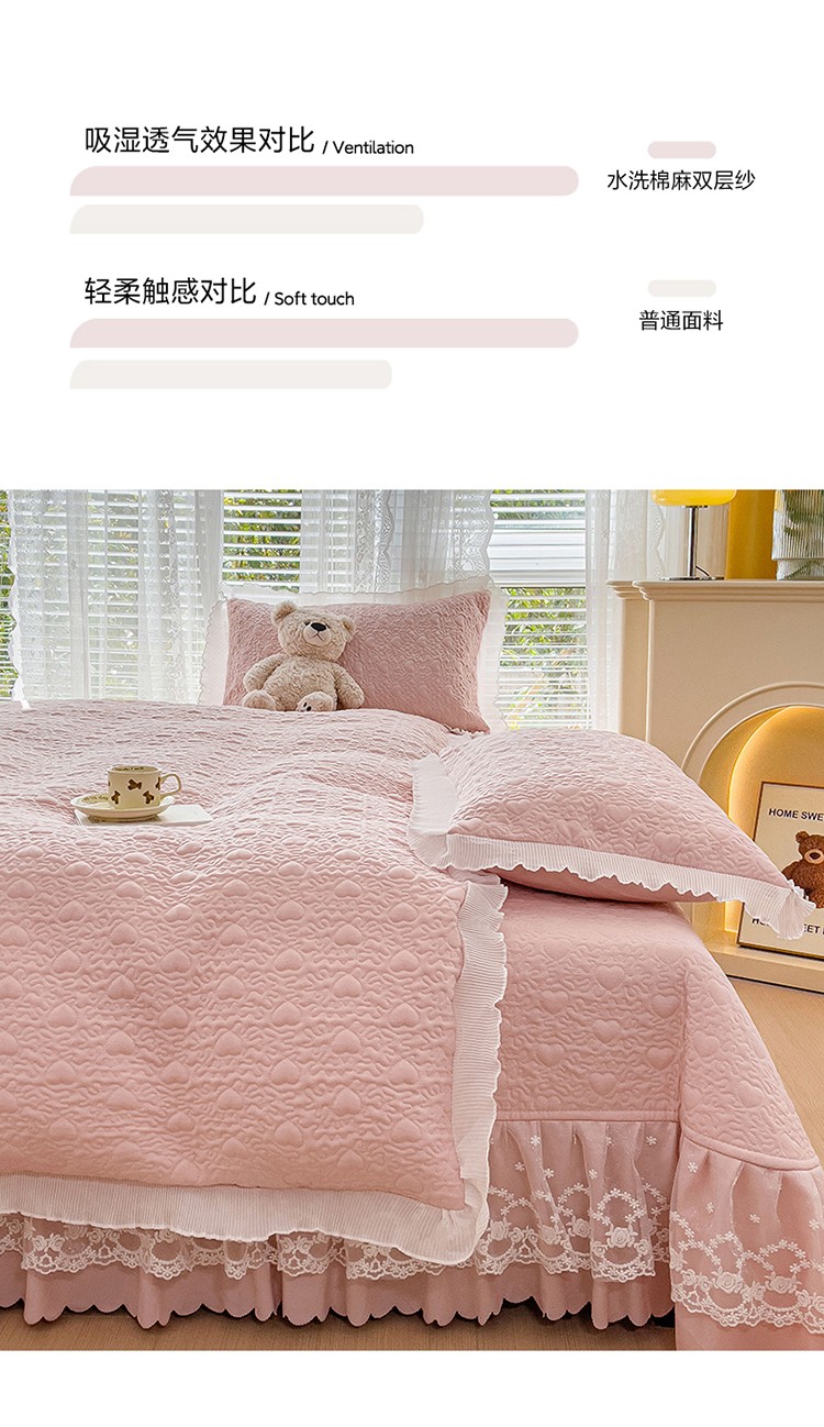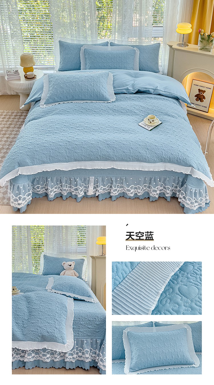 (总)2025水洗棉麻双层纱纯色多功能蕾丝床盖四件套 夹棉被套夏被两用套件直播爆款, 公主粉,抹茶绿,浪漫紫, 天空蓝, 冰川灰