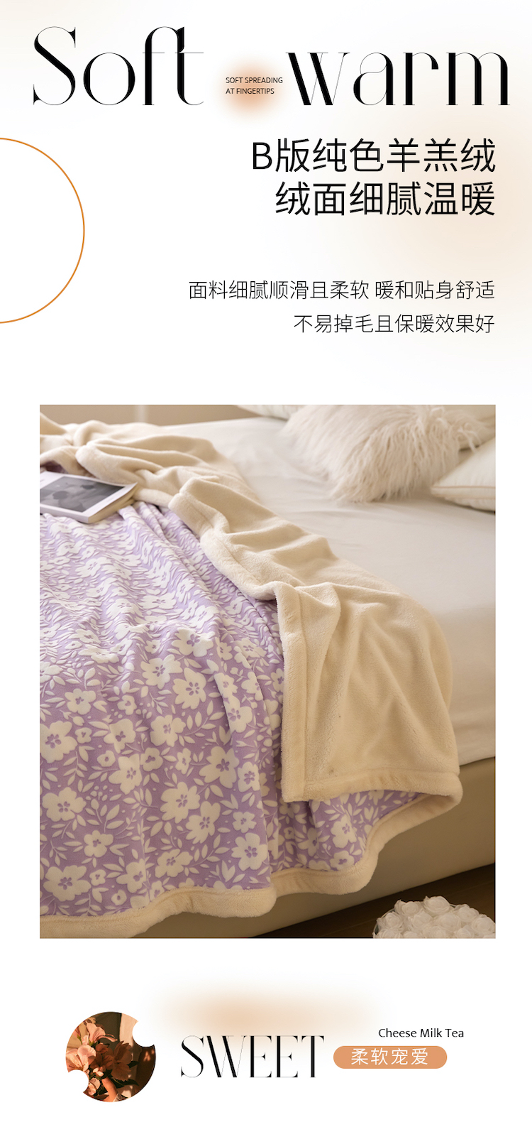 (总)铭动家纺 2024新款牛奶绒拼接款纯色保暖毯,粉色,灰,卡其,蓝灰,米白,天蓝