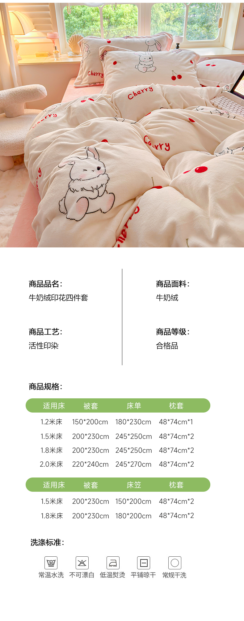 商品名称:呗旺鹿 2023新款高克重加厚印花牛奶绒四件套直播 樱桃兔