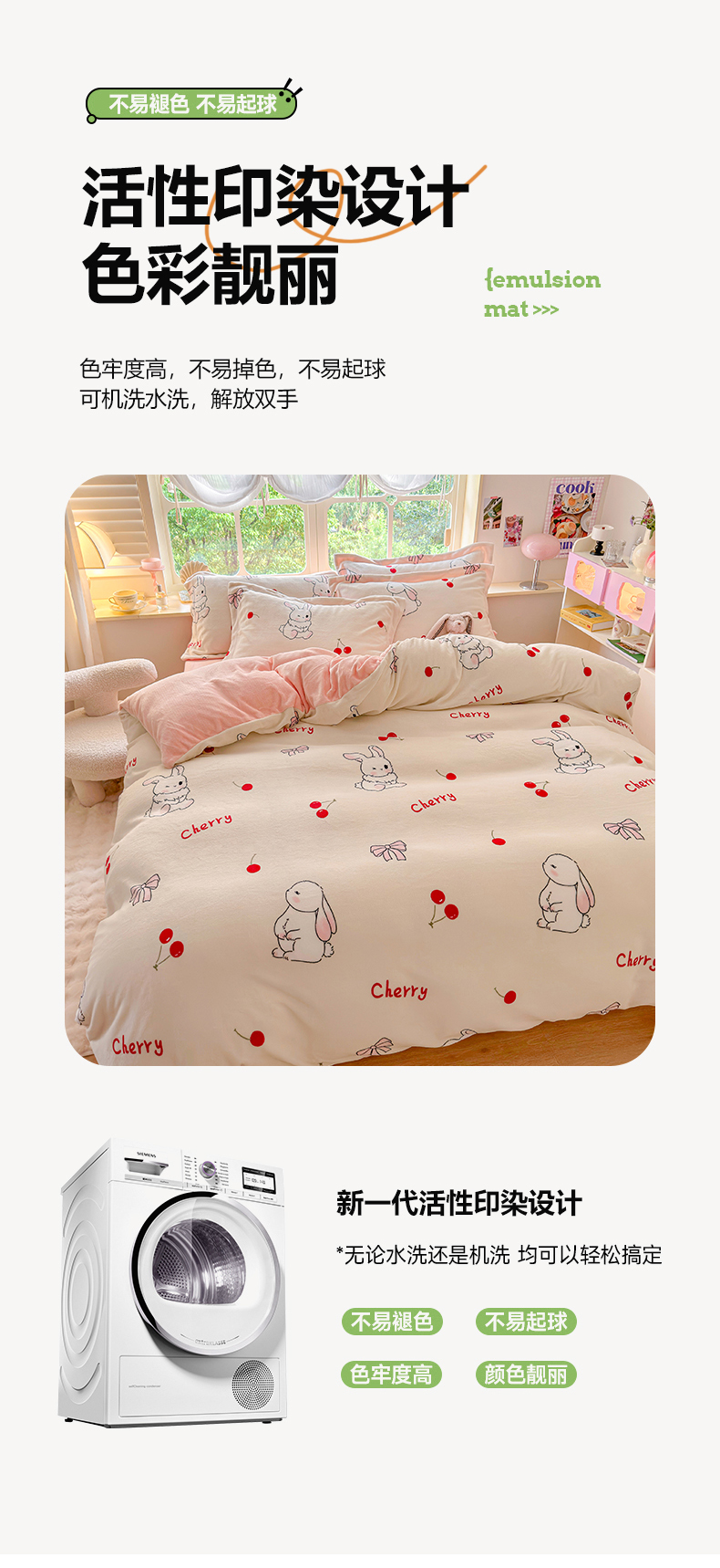 呗旺鹿 2023新款高克重加厚印花牛奶绒四件套直播 樱桃兔