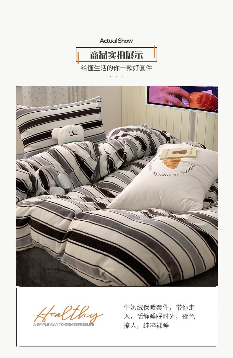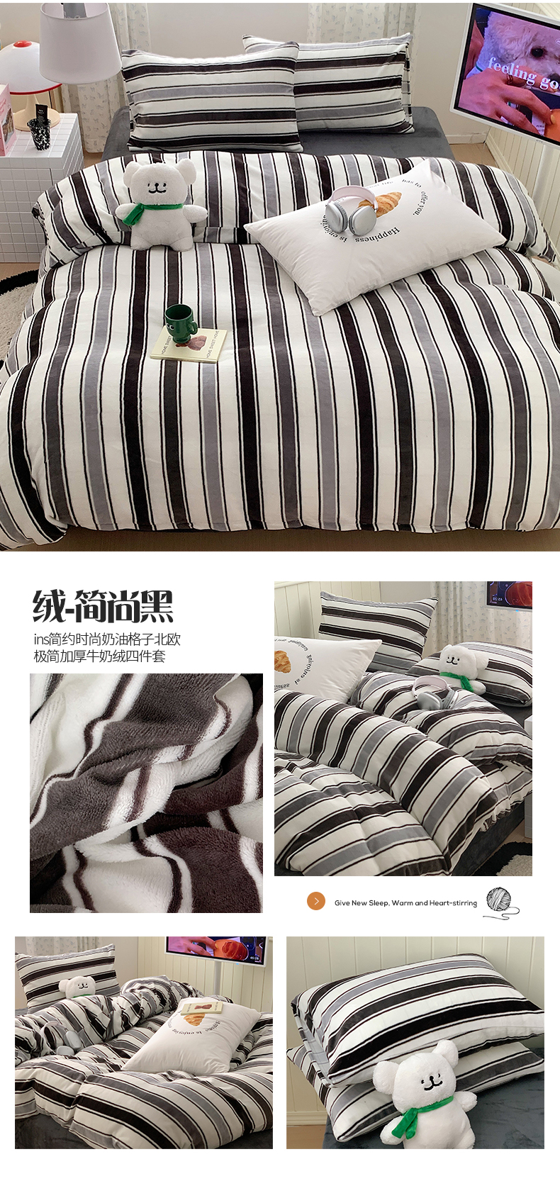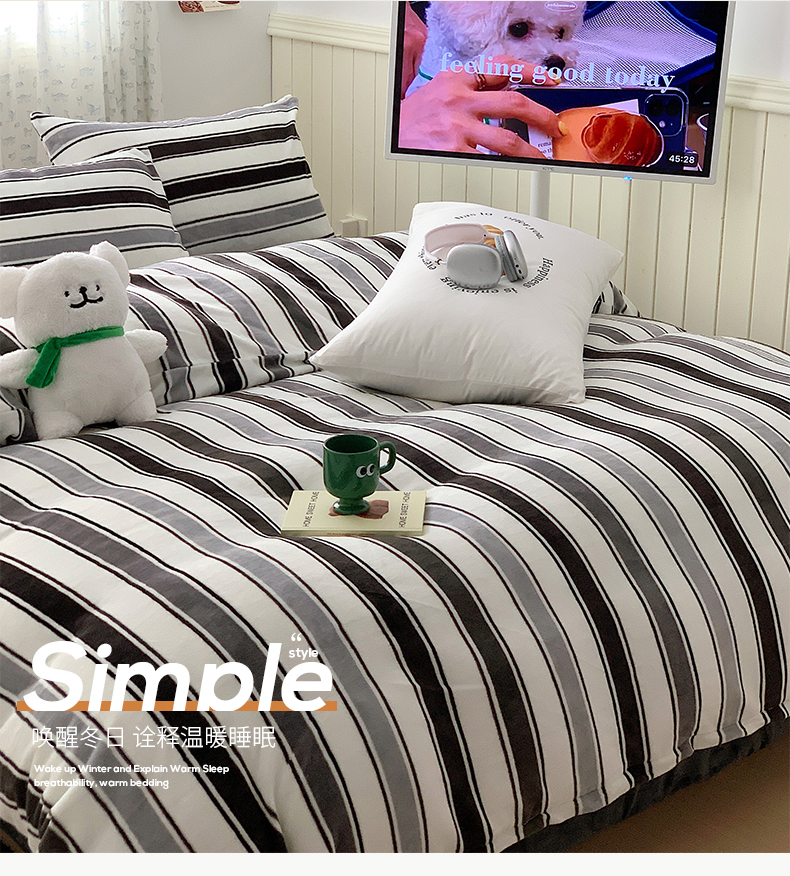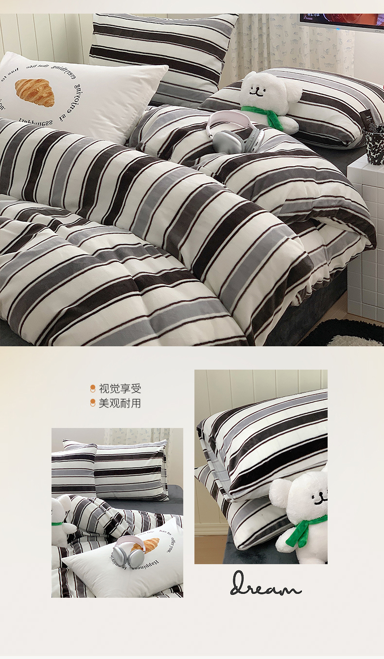 商品名称:桃子家居 2023新款ins简约时尚奶油格子北欧极简加厚牛奶绒四件套 简尚黑