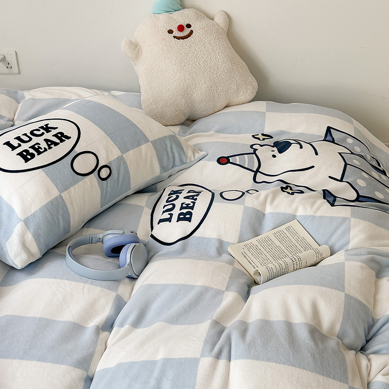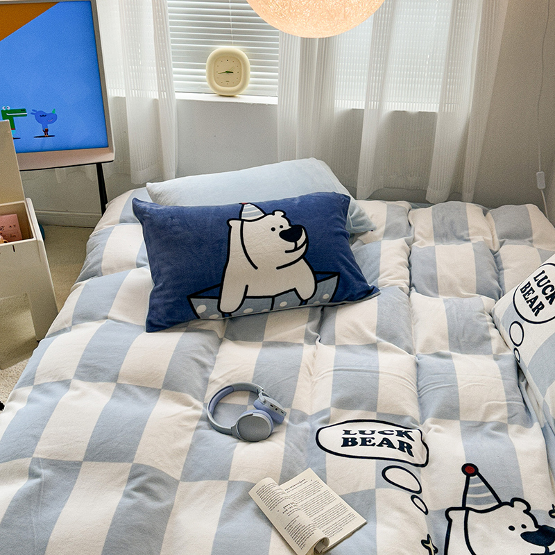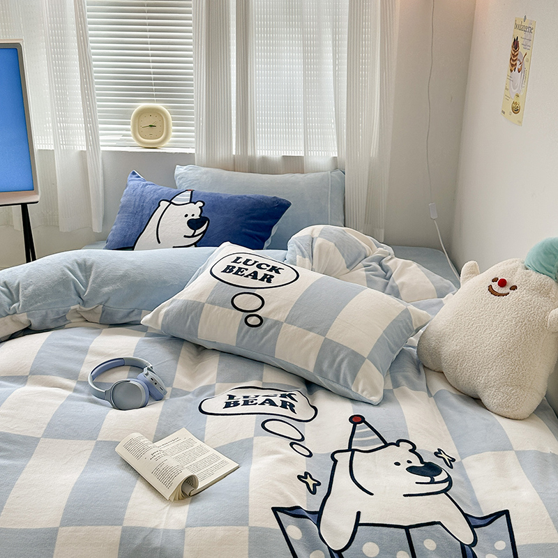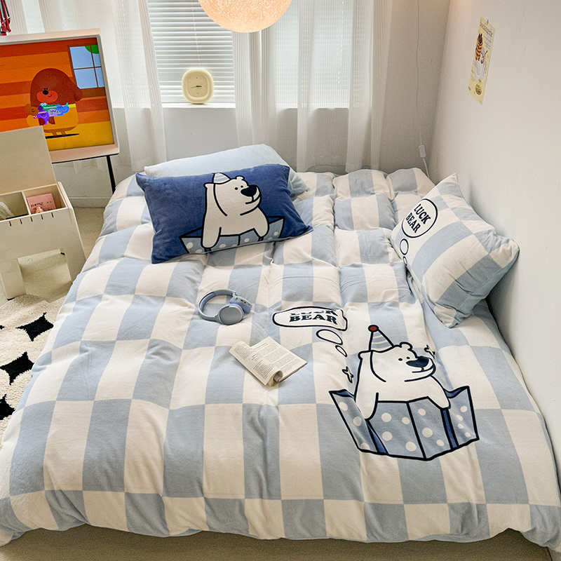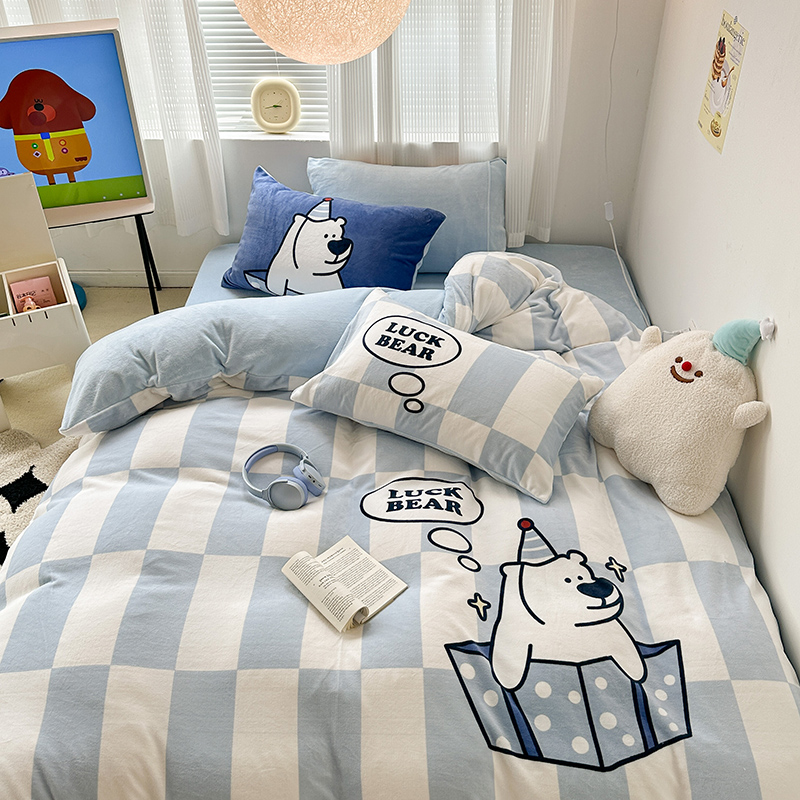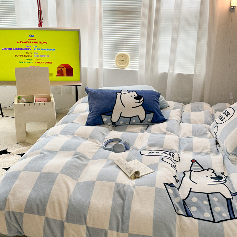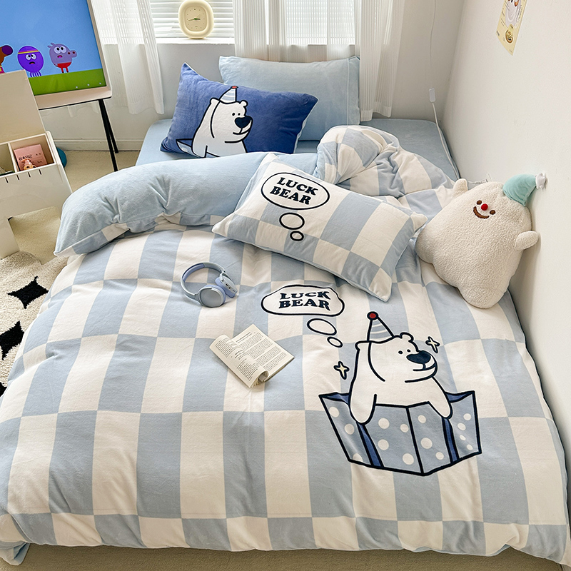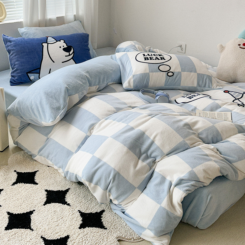 昔可家纺 2023新款大版数码印花保暖牛奶绒四件套 蓝格礼物熊
