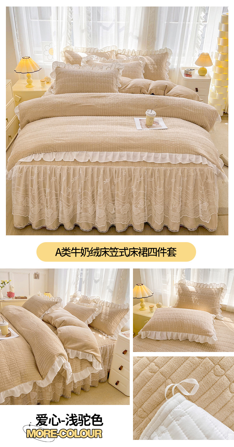 当前位置: 91家纺网 > 商品网购 > 床品套件 > 四件套 > 牛奶绒四件套 > 宜凡家纺 2023新款牛奶绒印花夹棉被套床笠式床裙四件套 爱心-浅驼色