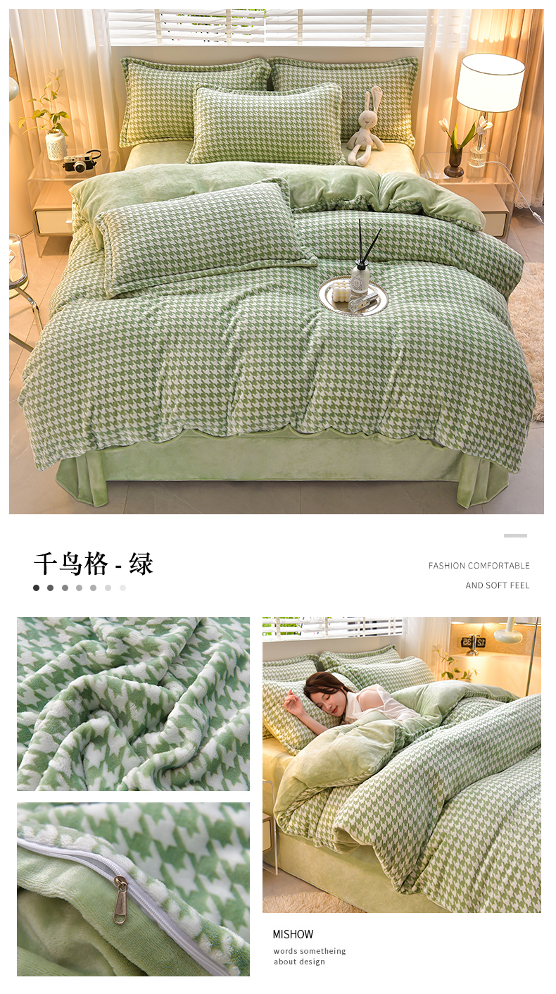 畅畅家纺 2024新款高克重8斤加厚牛奶绒6D雕花绒印花水晶绒金貂绒法莱绒四件套 千鸟格-绿