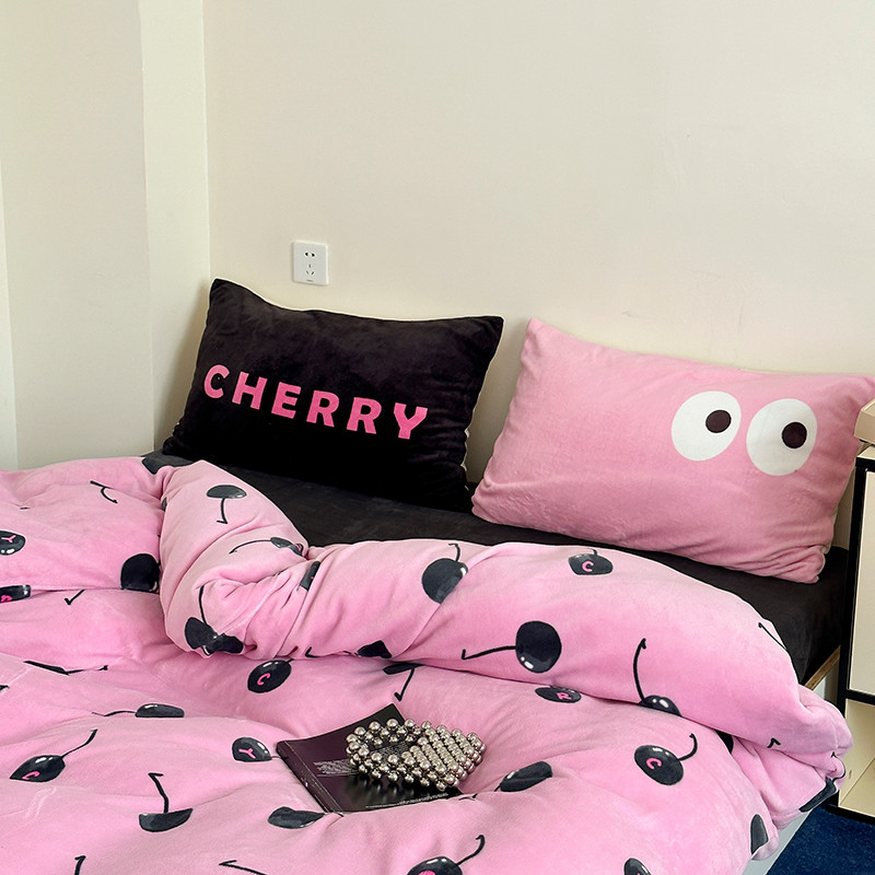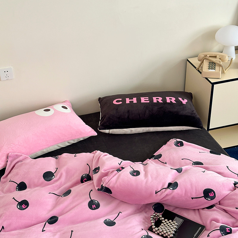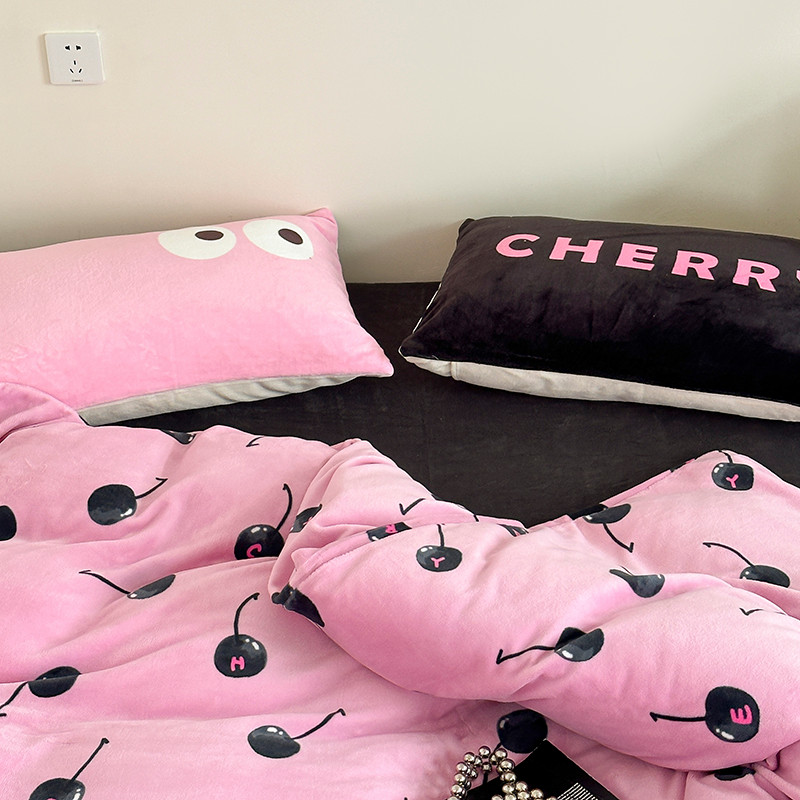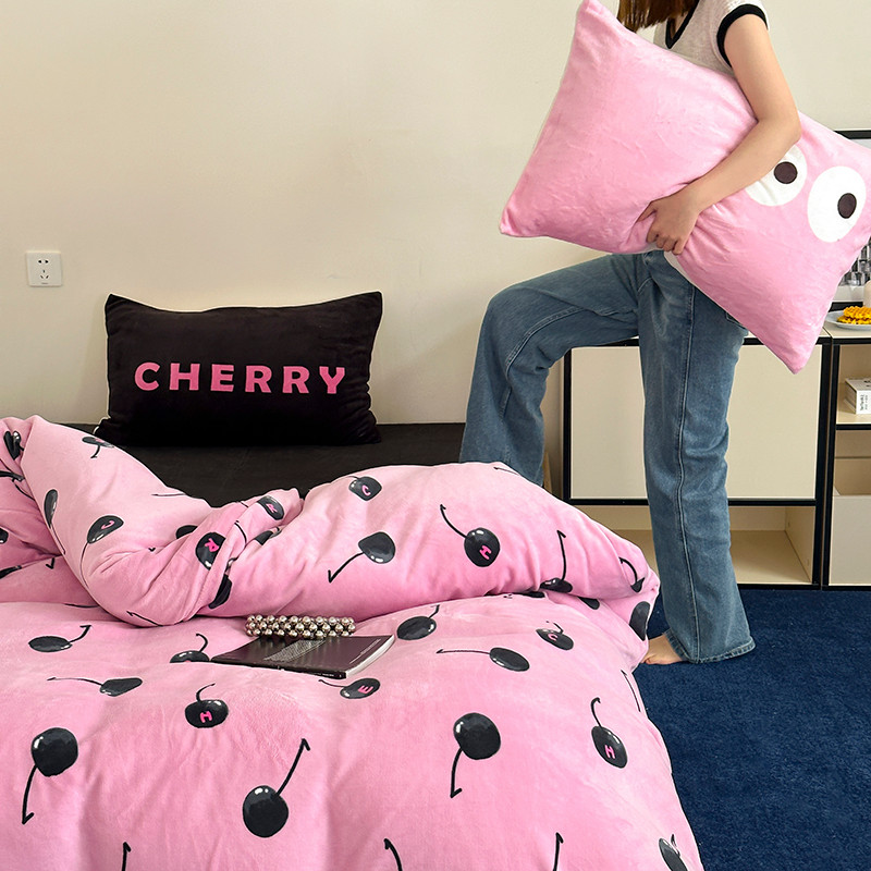 商品名称:昔可 2023新款大版印花枕套牛奶绒系列四件套-模特图 黑粉樱桃