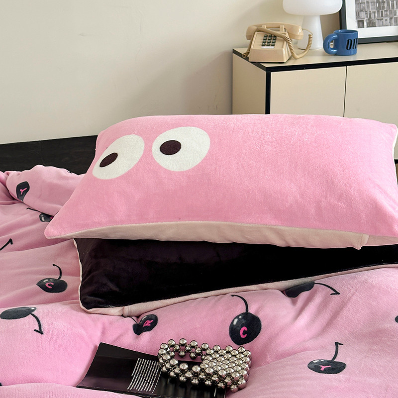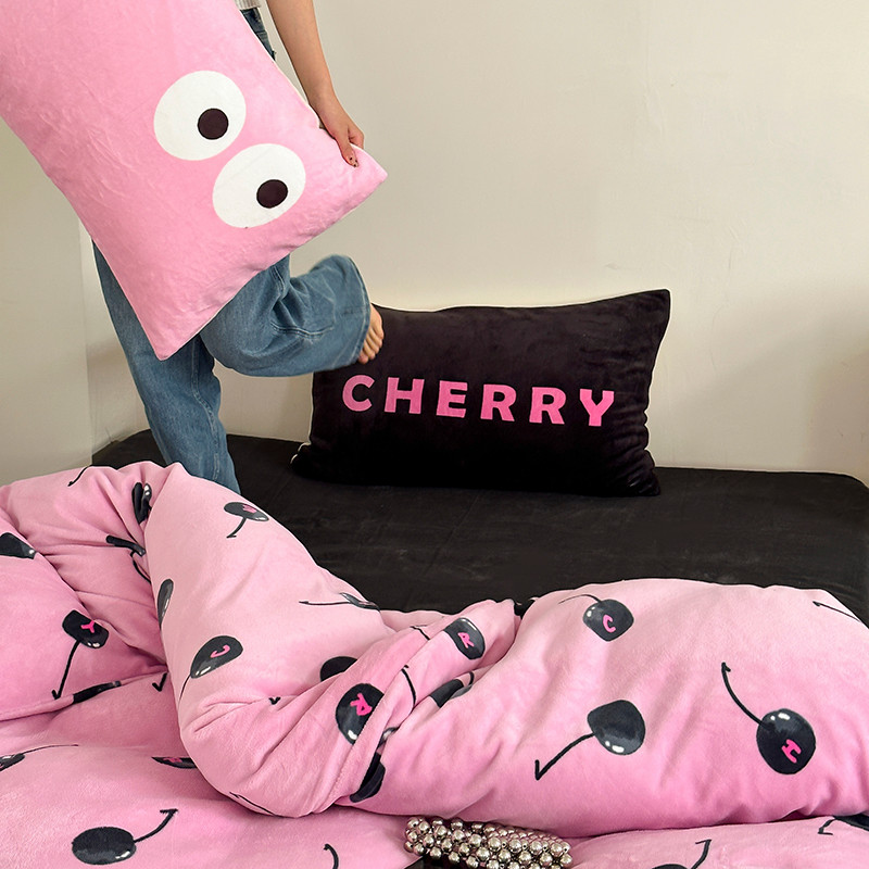 昔可 2023新款大版印花枕套牛奶绒系列四件套-模特图 黑粉樱桃