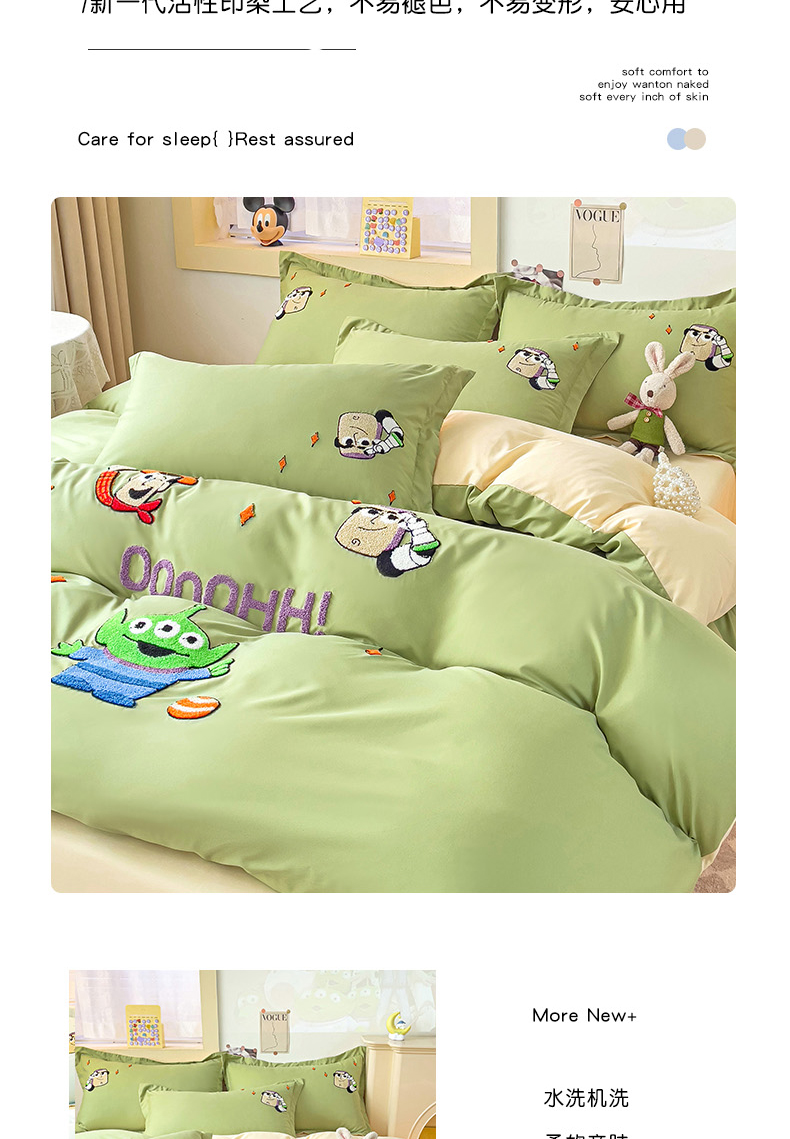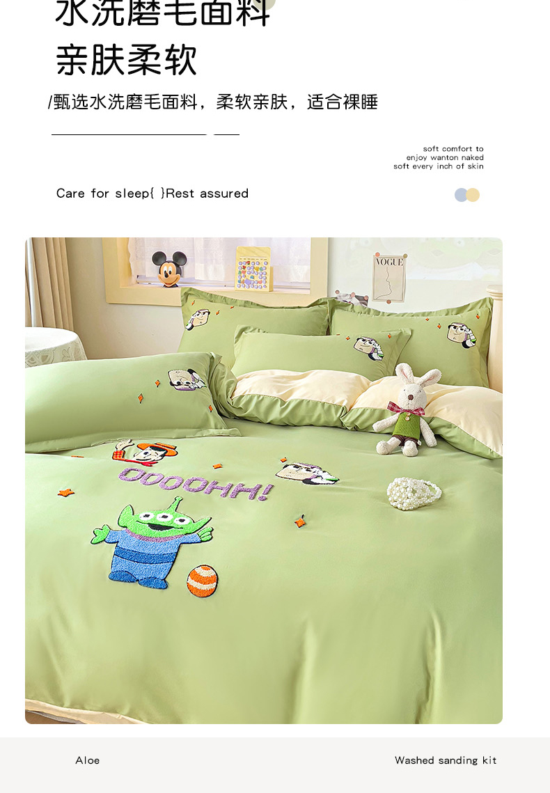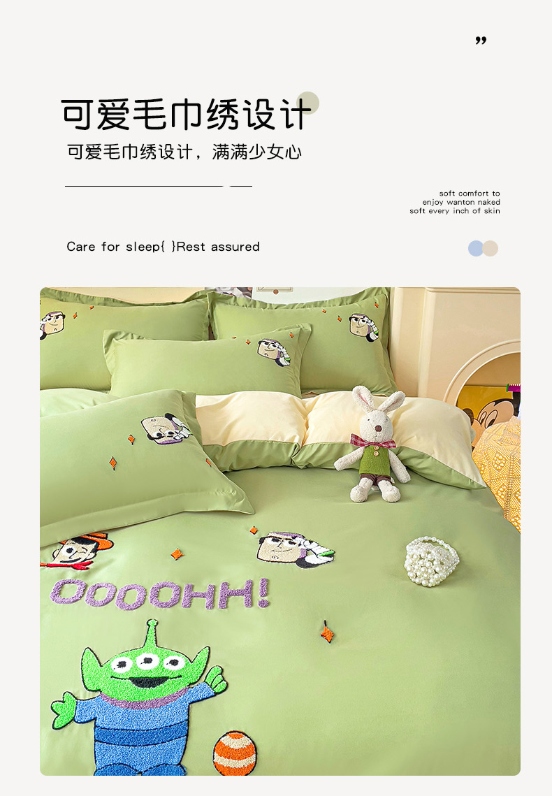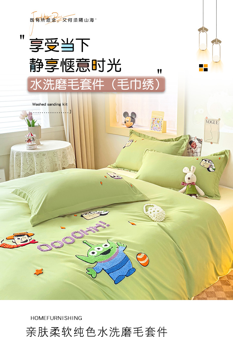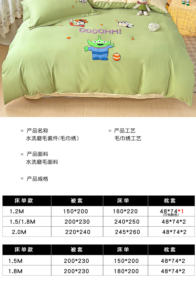 商品名称:娜娜 2023新款水洗磨毛毛巾绣四件套 胡迪和巴斯灰绿+白