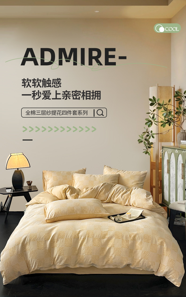 ab家纺 2024新款全棉三层纱提花四件套系列-方格 方格杏