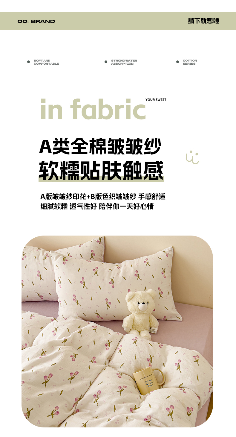 (总)木楌家居 2025新款A类全棉皱皱纱印花四件套,甜心宝贝,薄雾玫瑰,枫林 咖,枫林 绿,可颂,兰亭序,梦蝶,觅森,墨韵,晚棠,小确幸,伊洛娜,云梦泽,半夏 粉,草莓啵啵,初微,可心 兰,可心咖,哈尼,兰菲,黎夏 粉,黎夏 兰,木兰,奶油爱心,宁静,清颜,芮汐,时序 黄,时序 桔蓝,苏潼,西棠,潇湘,星月,悠然,月瑶