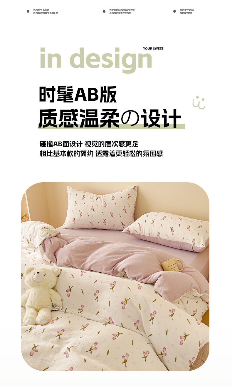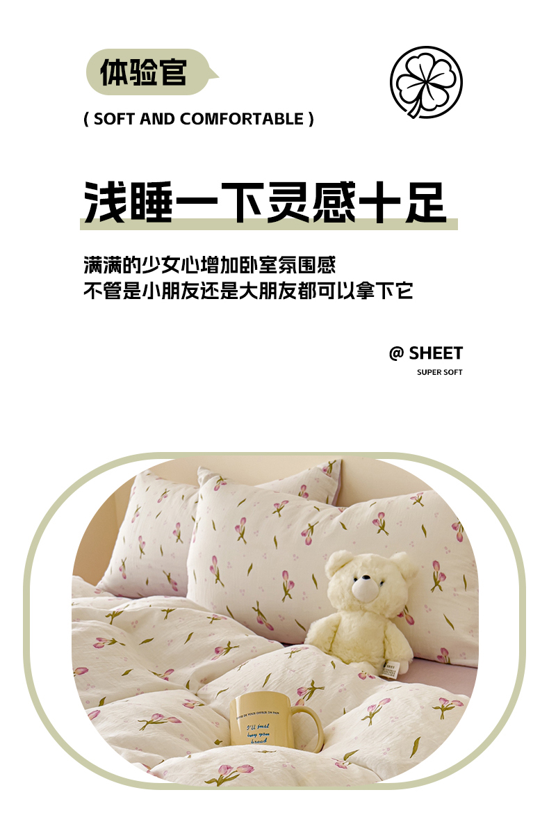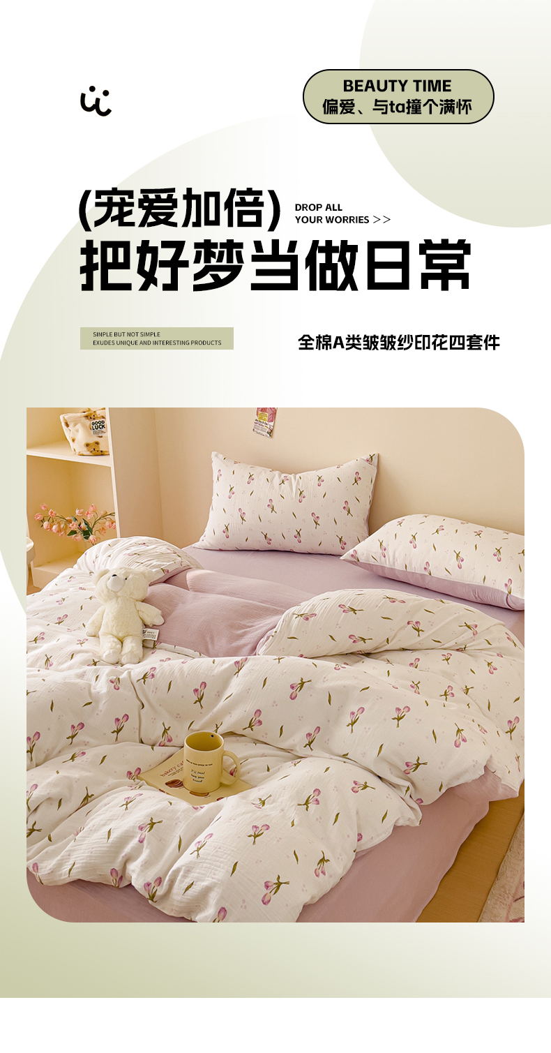 (总)木楌 2025新款全棉A类皱皱纱印花四件套,彼得熊,春泥,丁香-绿,丁香-紫,哈尼,海皮狗,涵雅,赫本熊,可心兰,可心咖,兰菲,美芽,木兰,奶油爱心,奶油波点,宁静,浅汐,沁香,微笑,星月,宾果熊,初颜,璎珞,花与兔,洛依,清新草莓,芮芮花,小彩蘑,小恐龙,小熊猫,幸运草,樱桃,知音,紫萱,小南国