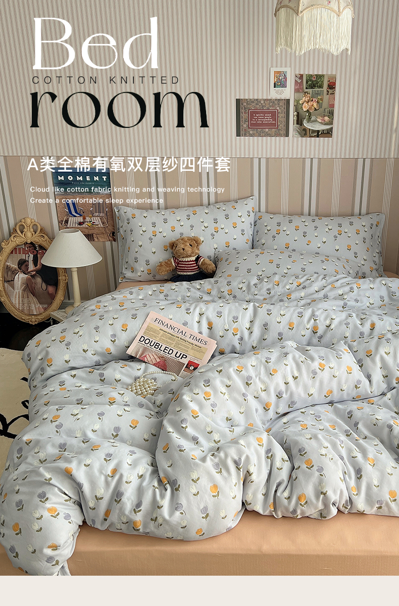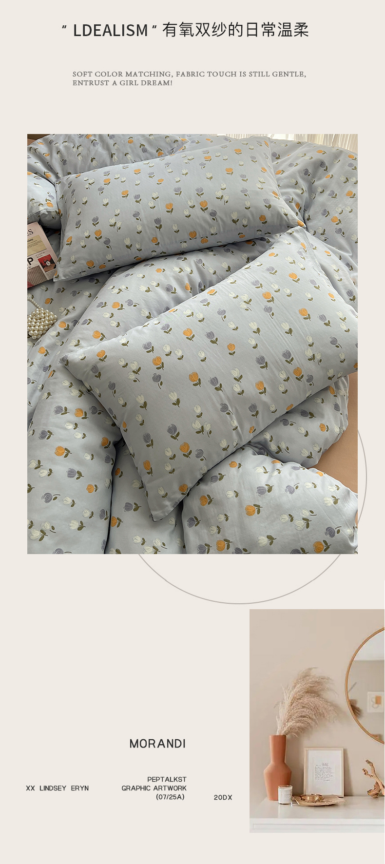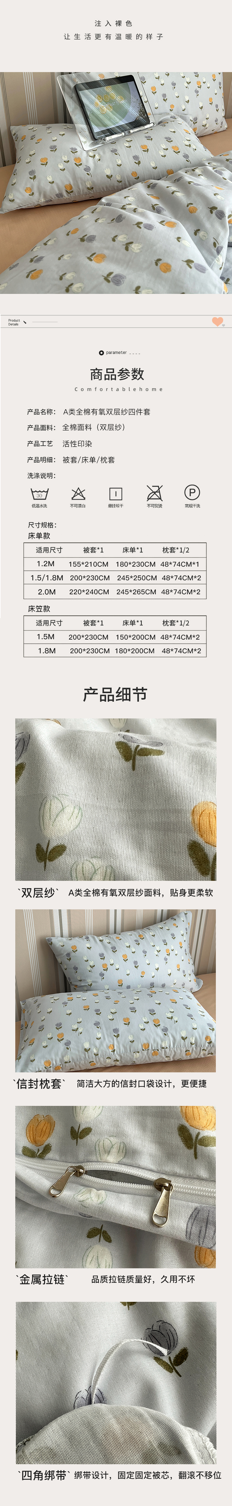商品名称:卧趣2024新款A类全棉有氧双层纱四件套 仲夏花开灰