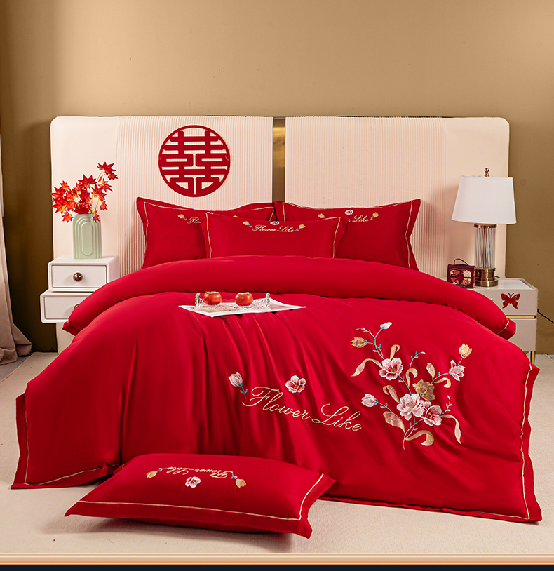 银石 2024新款60新疆长绒棉大红婚庆绣花四件套 倾心一片