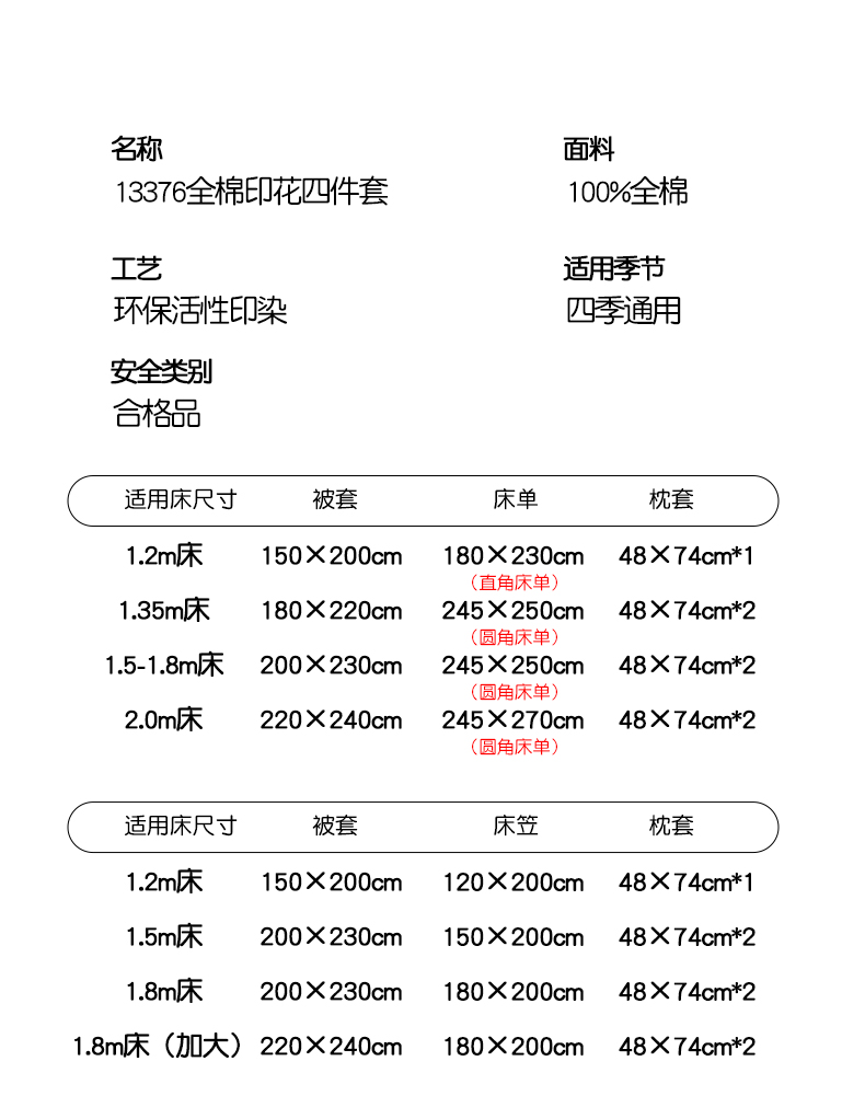 1.8m床笠四件套被套200*230 | ¥150.00 |