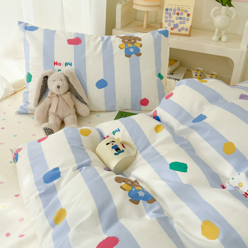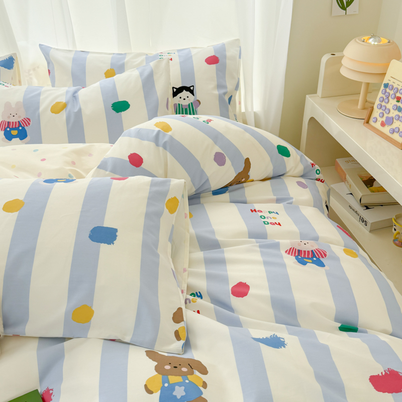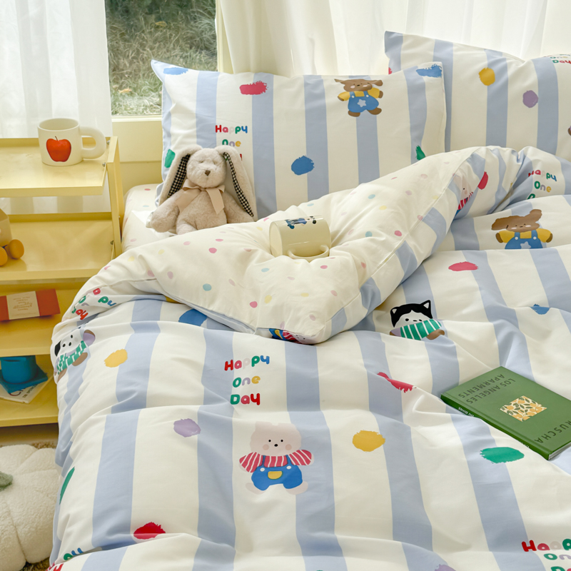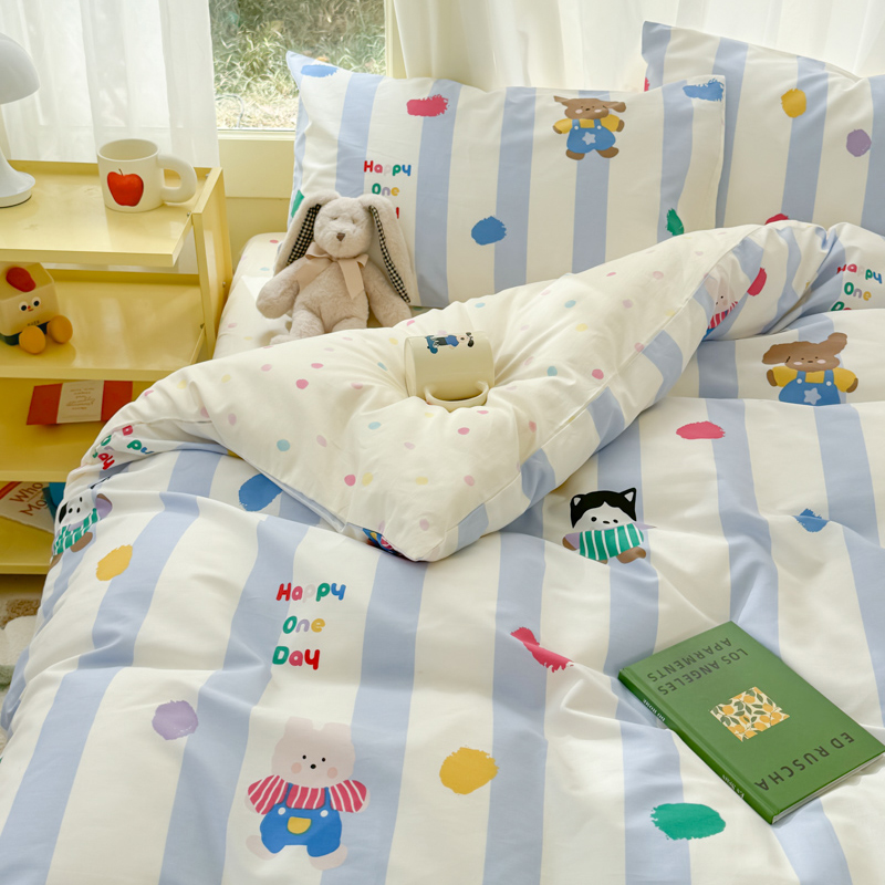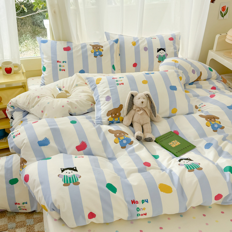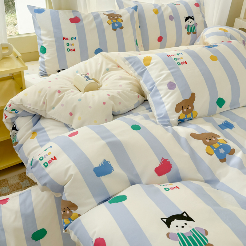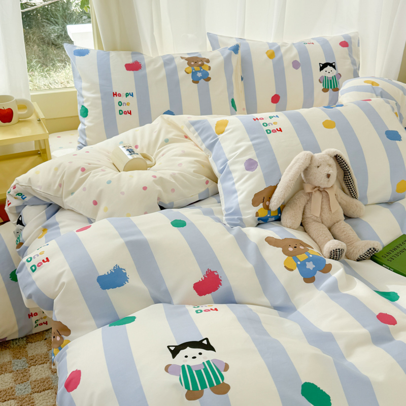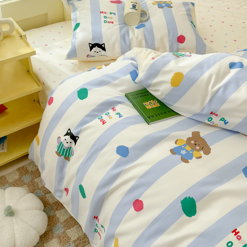 (总)呗旺鹿 2026新款全棉纯棉40支13070卡通印花四件套-场景二,萌星,鼻涕狗,果子象,机灵猫,可爱星人,幸福小熊