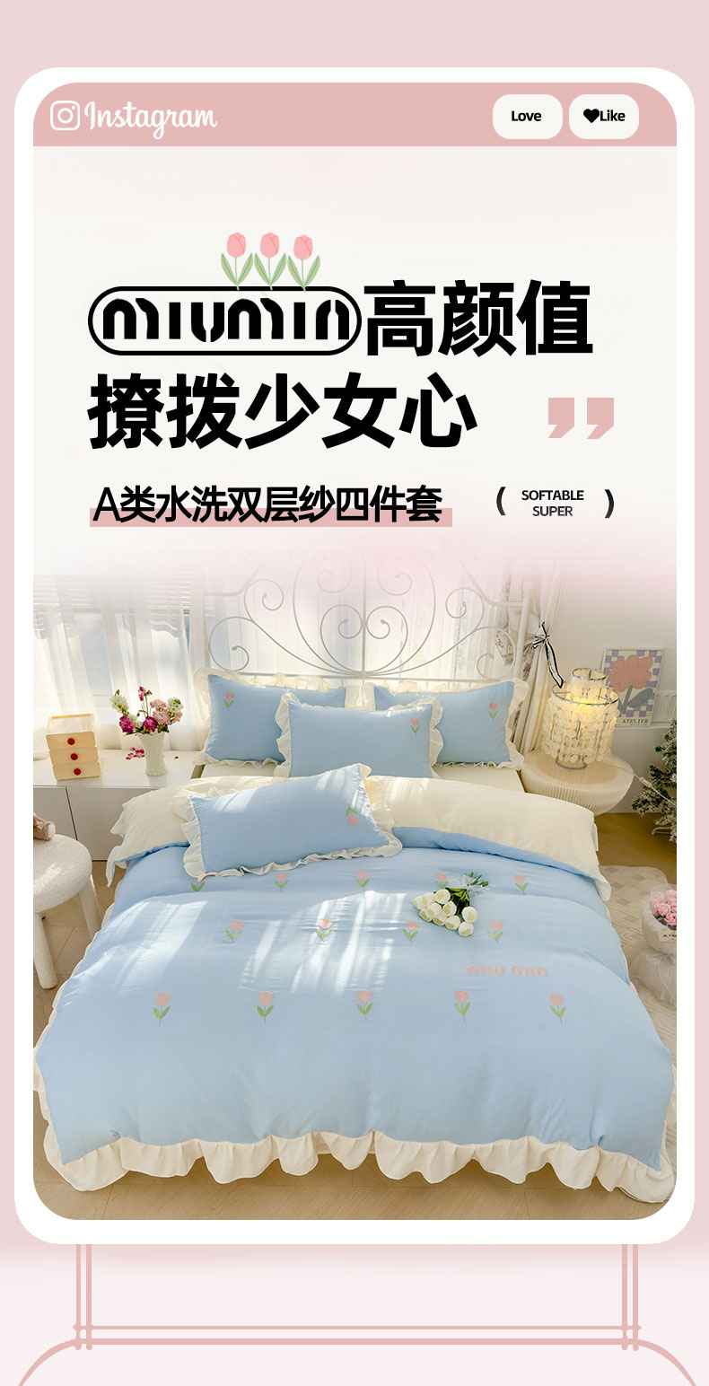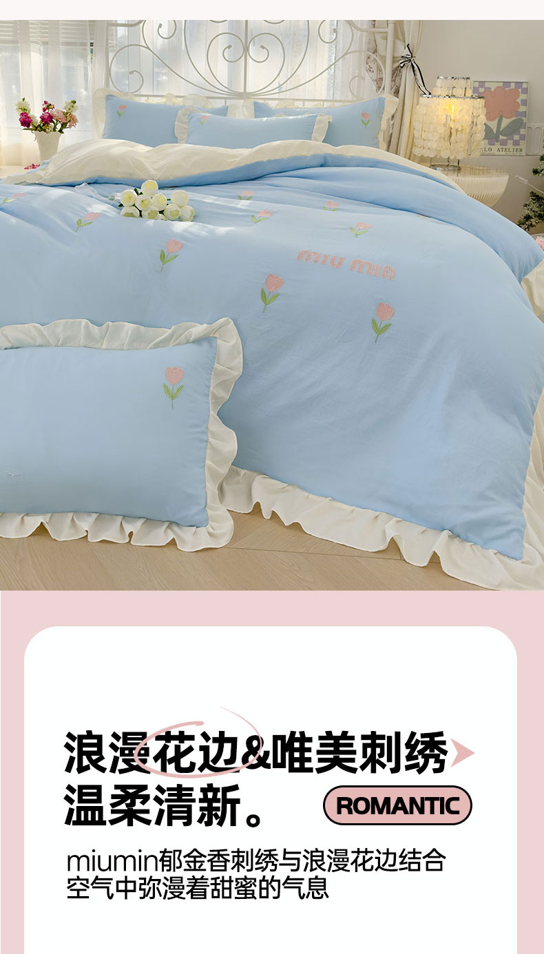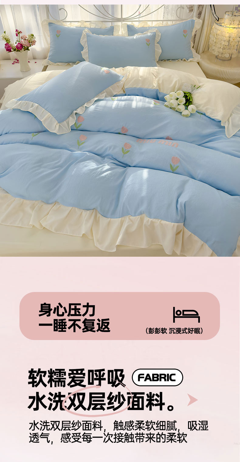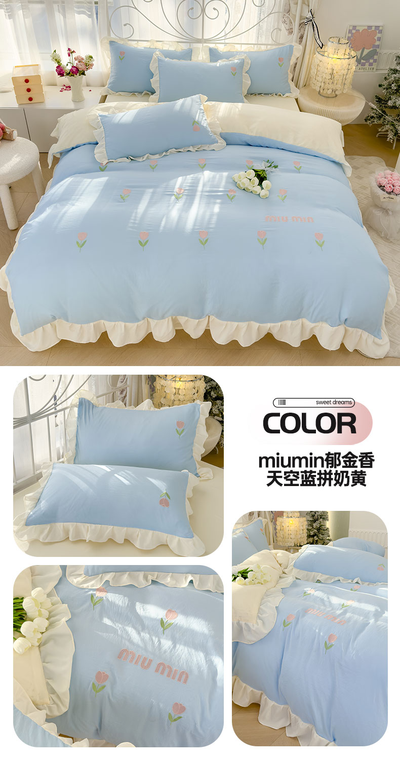 当前位置: 91家纺网 > 商品网购 > 床品套件 > 四件套 > 其它四件套 > 灰鲸 2025新款水洗双层纱miumin郁金香刺绣四件套 miumin郁金香-天空蓝拼奶黄