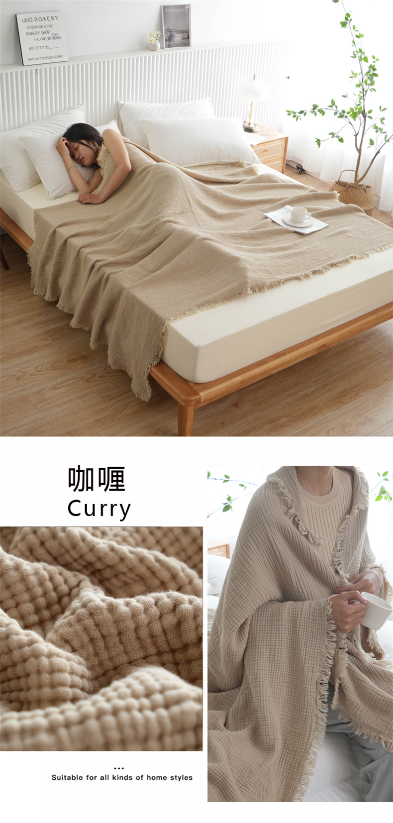 商品名称:凌云家纺 2025新款四层皱皱纱流苏毯盖毯浴巾 咖喱130x170cm