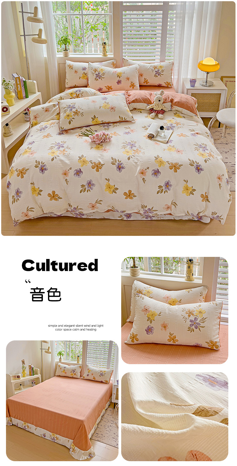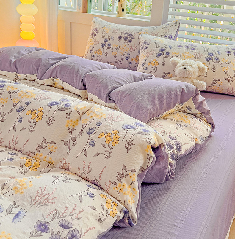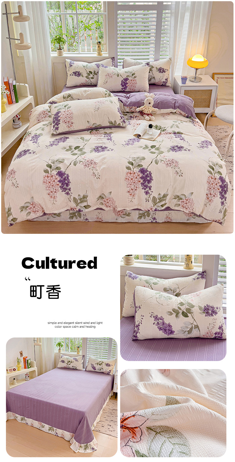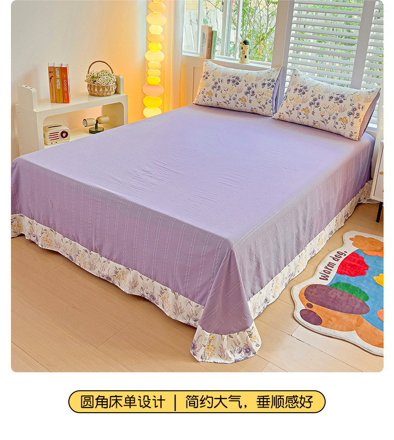优选良品 2025新款韩版轻奢皱皱纱水洗棉拼色床单床笠四件套三件套-芋泥紫,芋泥紫