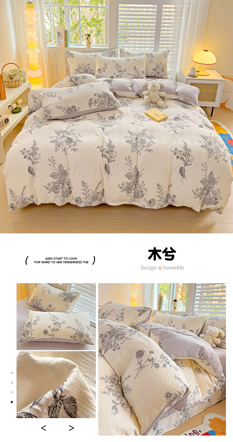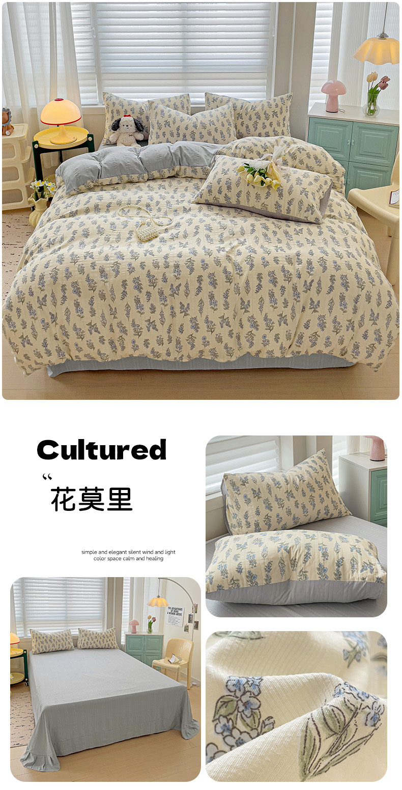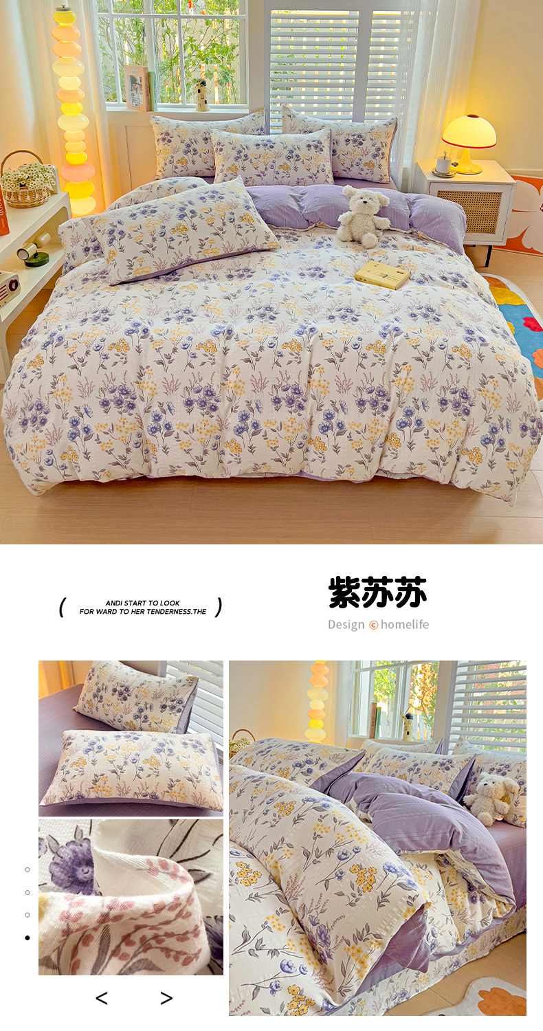 优选良品 2025新款韩版轻奢皱皱纱水洗棉拼色床单床笠四件套三件套-芋泥紫,芋泥紫